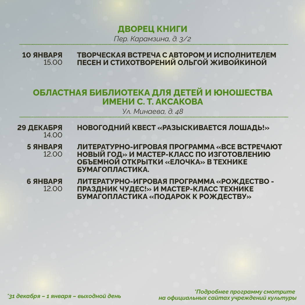 Две литературно-игровые программы вместе с мастер-классами готовит областная библиотека для детей и юношества имени С.Т. Аксакова. Первая пройдет 5 января под названием «Все встречают Новый год», ее участники смогут изготовить объемную открытку «Елочка» в технике бумагопластика. А 6 января в ходе программы «Рождество – праздник чудес» в той же технике можно будет создать подарок к Рождеству. Начало программ в 12:00.