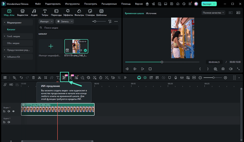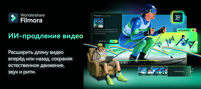 erid: 2VfnxxWKyJ9 В эпоху доминирования коротких видеоконтентов (Shorts, Reels, TikTok) и высокого требования к визуальному качеству, контент-мейкеры постоянно сталкиваются с одной и той же проблемой. Кадр обрывается рано, важная фраза не успевает завершиться или критическое для сюжета движение прерывается: видеоклип может не соответствовать требуемой длине для площадки. Традиционные методы решения этой проблемы — продлить видео вручную, используя статичные паузы, замедление или повтор кадров. Но ручное продление видео почти всегда выглядит неестественно. Зритель моментально замечает скачки движения, остановку сцены, неестественный ритм ролика. Продлить видео без пересъемки ранее было практически невозможно. В результате, многие видеоклипы, особенно спонтанные и ценные моменты, оставались в статусе «слишком короткое». Выход – ИИ-продление видео — инструмент, внедренный в AI редактор видео Filmora. Нейросеть автоматически «дорисовывает» новые кадры, чтобы увеличить длину видео. Преимущество инструмента: он сохраняет исходную динамику сцены, освещение, стилистику, ритм ролика, обеспечивая продление видео с сохранением движения. Нейросеть для расширения видео работает как вперед, так и назад по клипу, что подходит для создания плавных концовок для YouTube, Instagram, TikTok и презентаций. Часть 1. Почему стоит выбрать ИИ-продление видео в FilmoraВыбор Filmora для редактирования видео и расширения видео обоснован рядом уникальных преимуществ, которые делают процесс максимально эффективным и удобным: