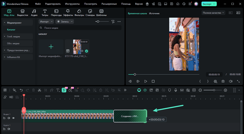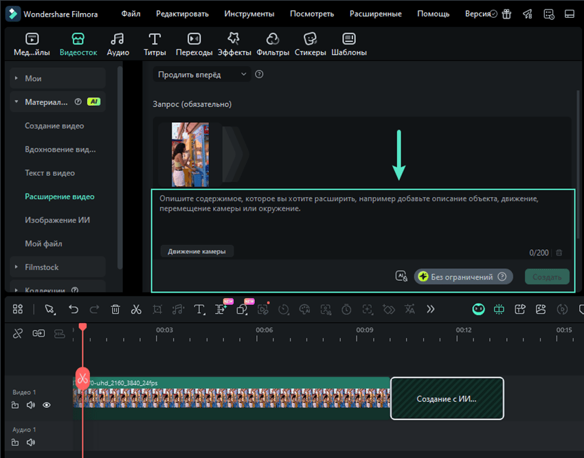 Часть 2. Пошаговая инструкция: как продлить видеоконтент с помощью ИИ в FilmoraНарастить длину записи в Filmora — простой и интуитивно понятный процесс, доступный на ПК и Mac. Шаг 1: Нужно добавить клип на временную шкалу. Импортируйте исходный материал в видеоредактор Filmora. Шаг 2: Для активации курсором перетащите умное перо. Кликните на значок «ИИ-продление видео». Затем наведите курсор на край клипа и потяните его влево, чтобы продлить назад, или вправо — чтобы продлить вперёд. Определитесь, на сколько секунд вы хотите увеличить длину материала, решая проблему «как исправить короткий видеоклип». Шаг 3: Наберите текст для сложных сцен. Опишите желаемое продолжение сцены. Предположим: «В продолжение предыдущего видеоролика две девочки весело играют». Это позволяет добиться продления видео без потери качества даже при изменении освещения. Запустив продление, кликните кнопку «Создать». Шаг 4: Инструмент ИИ-продление видео объединит ваш клип, промпт (если был) и выбранную продолжительность, генерируя мягкое и нужное расширение записи, которое отлично интегрируется в вашу работу, позволяя добавить к ней несколько секунд. Часть 3. Где увеличивать длительность записи полезнее всегоИИ для увеличения длины видео становится незаменимым инструментом в самых разных сценариях:
