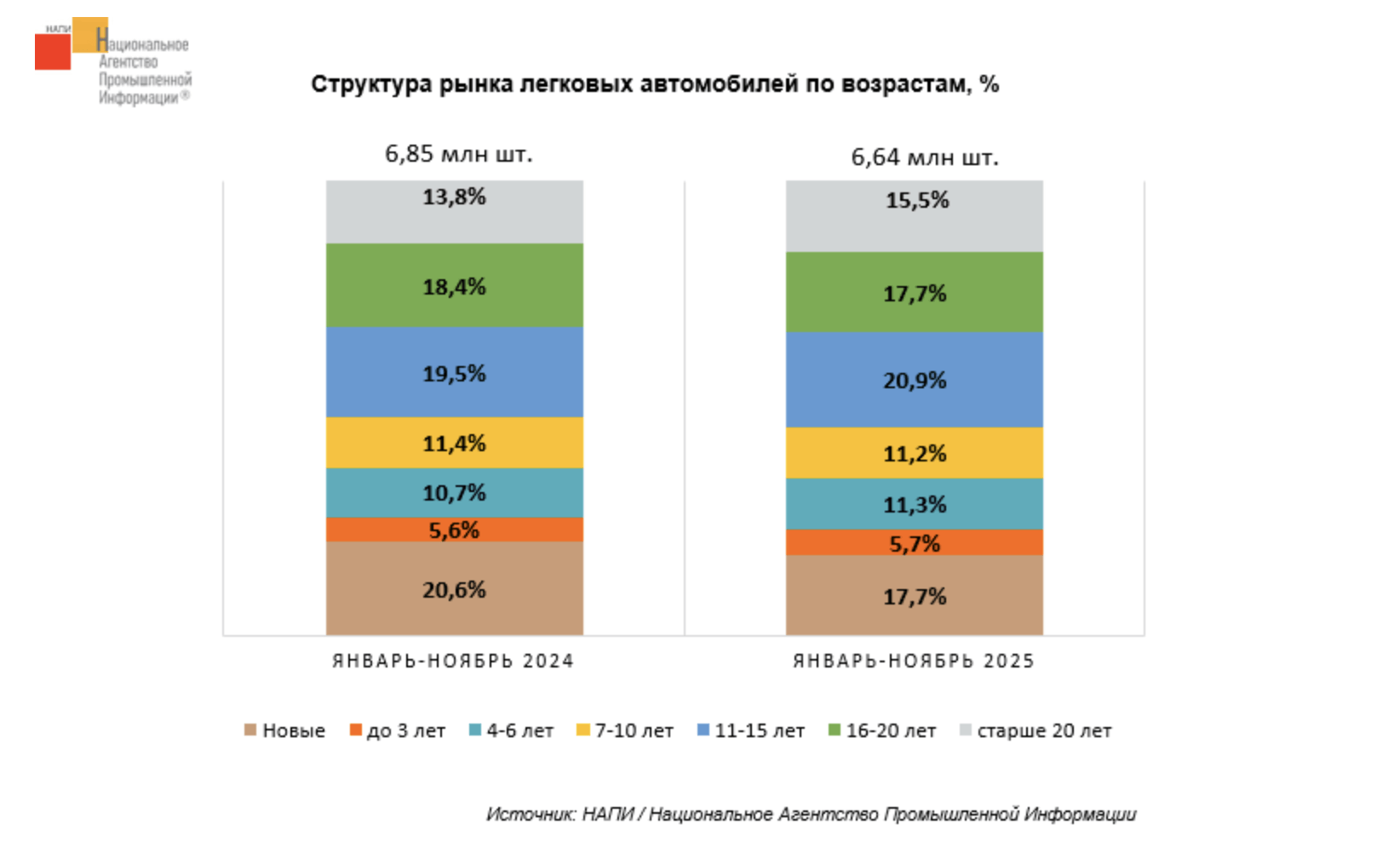 Интересно, что, по данным Национального агентства промышленной информации, на фоне общего снижения рынка растут продажи автомобилей старше 20 лет. За 11 месяцев нынешнего года было реализовано чуть более 1 млн таких авто – на 8,8% больше, чем в 2024-ом. Доля машин «20+» выросла на 1,7 процентных пункта Также рост продаж наблюдается и в других сегментах подержанных автомобилей. Продажи машин возрастом 4-6 лет увеличились на 2,3%, а 11-15 лет – на 3,5%. Автопарк продолжает стареть. |