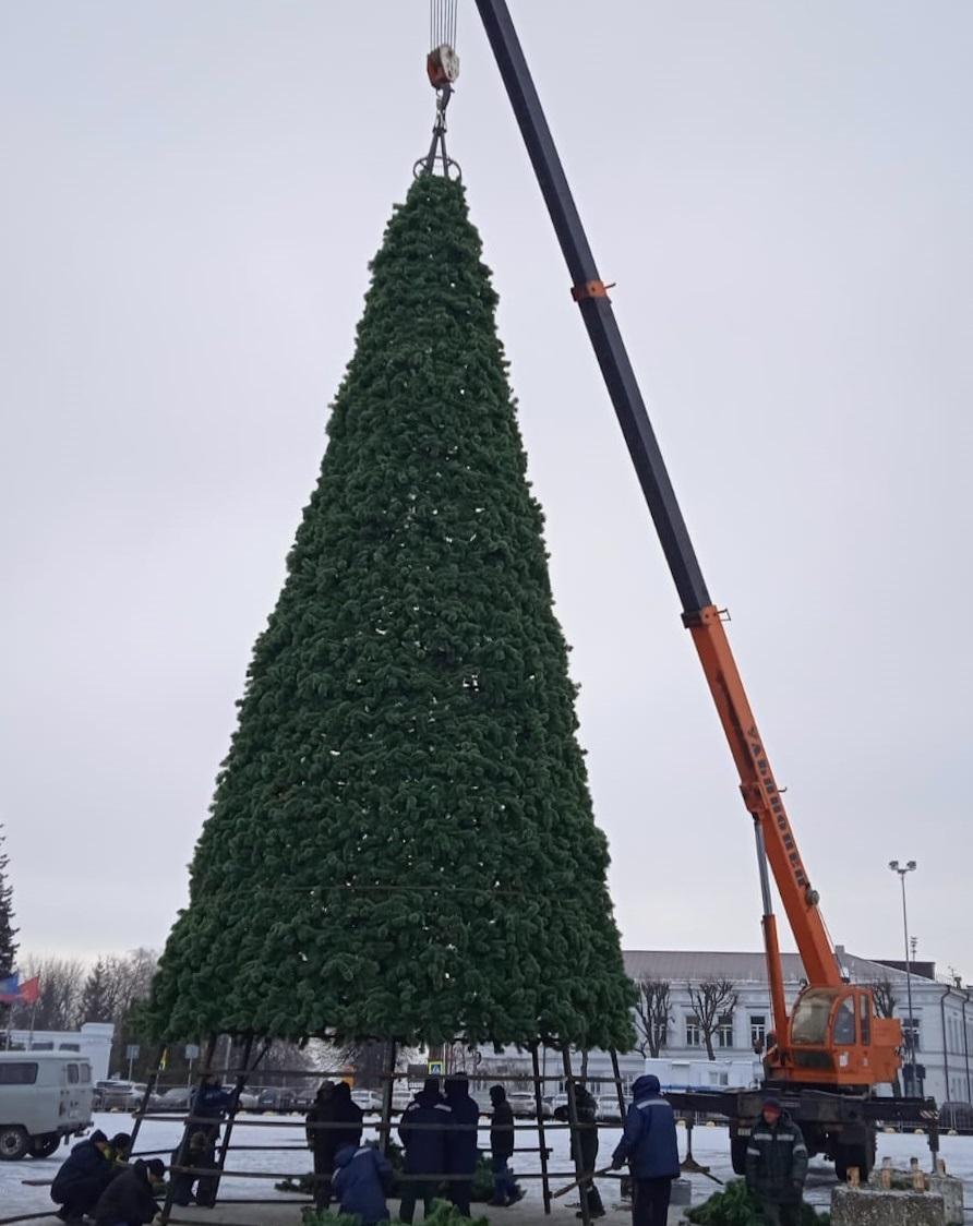 Работы по установке конусной елки на Соборной площади.