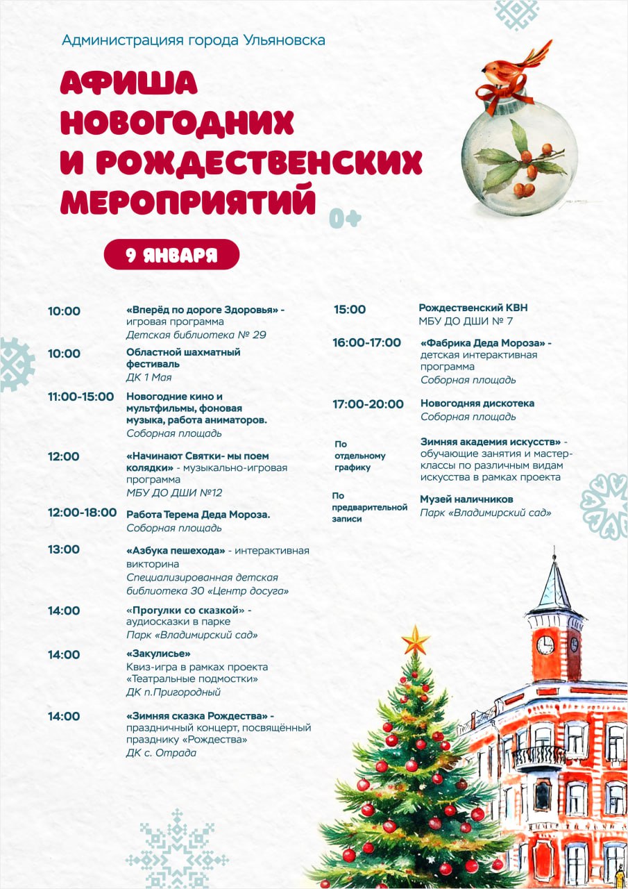 Праздничные мероприятия и рождественские встречи продолжаются. 9 января в Ульяновске запланировано много интересных событий для детей и взрослых — выбирайте, где провести этот зимний день. В программе — игры, познавательные квесты, концерты, мастер-классы и зажигательная дискотека на Соборной площади.