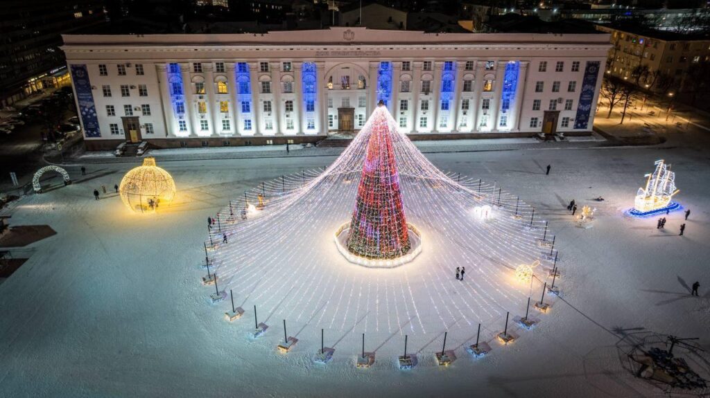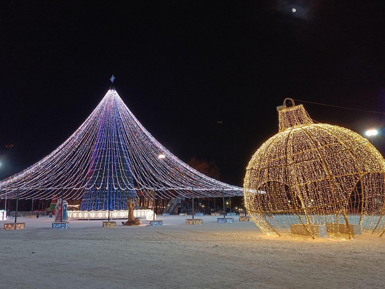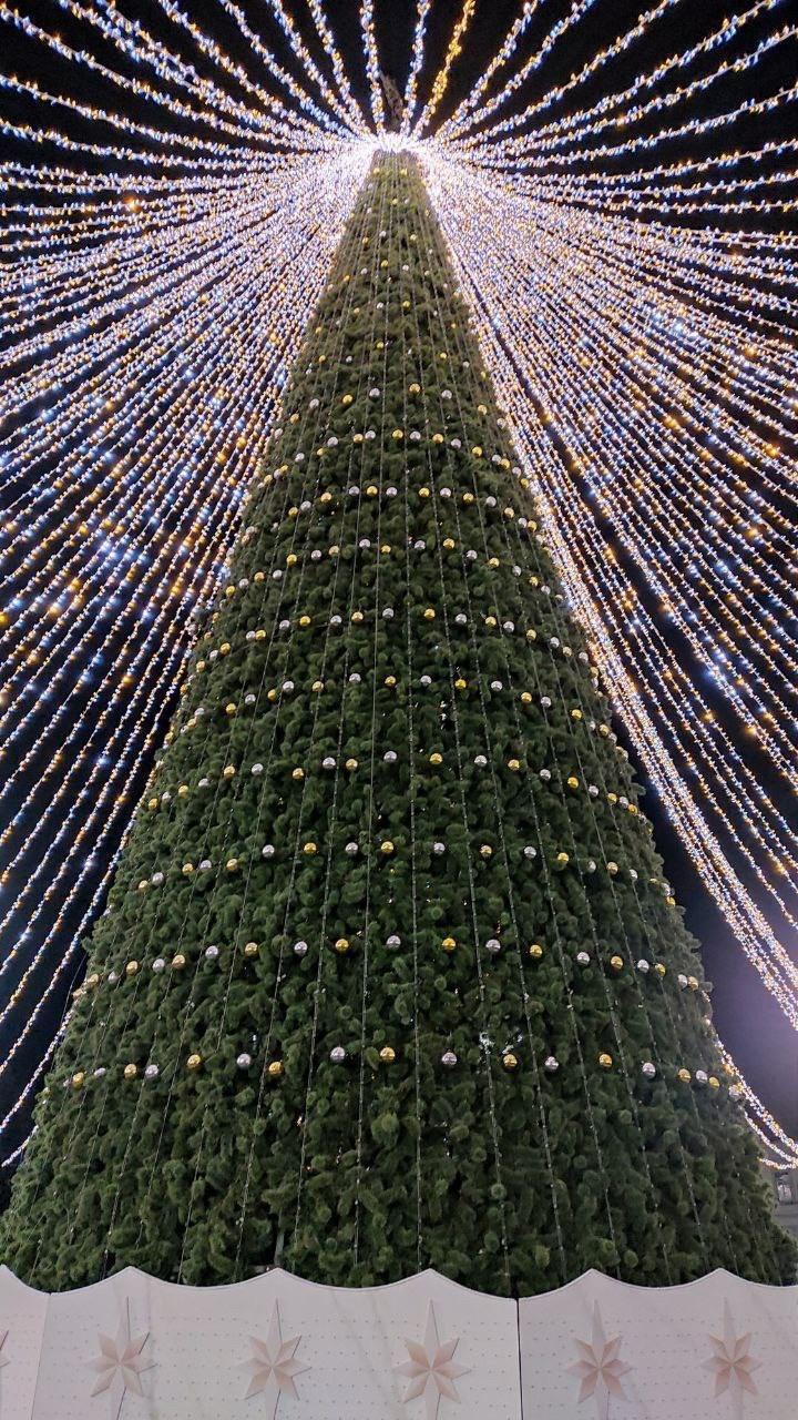 Настоящий прорыв был сделан в 2024, когда городские озеленители «накрыли» новогоднюю елку световым шатром, созданным из 8 километров гирлянд, натянутых на 136 нитях.