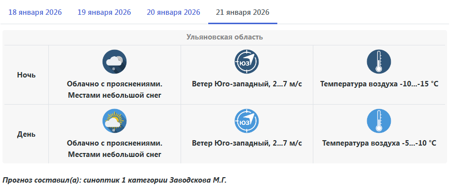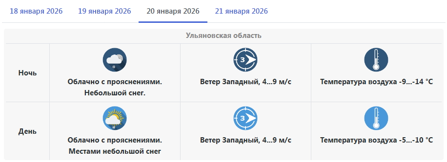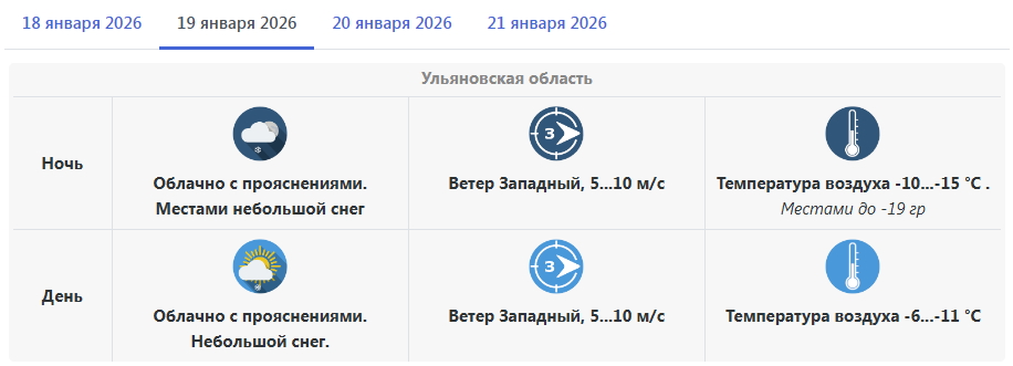 По прогнозу Гидрометцентра, в понедельник, 19 января, в связи с приближением западной ложбины ночные морозы ослабеют до -10°С, -15°С, пройдет небольшой снег. В последующие дни погода существенно не изменится.