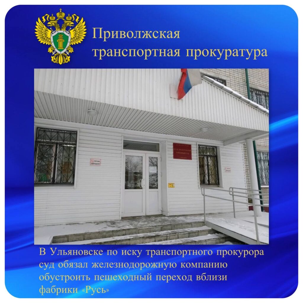 Ульяновская транспортная прокуратура добилась через суд приведения в порядок железнодорожного перехода в районе фабрики «Русь». Проверка показала, что объект на перегоне станций Ульяновск-Центральный – Белый Ключ не соответствует требованиям безопасности и доступности.