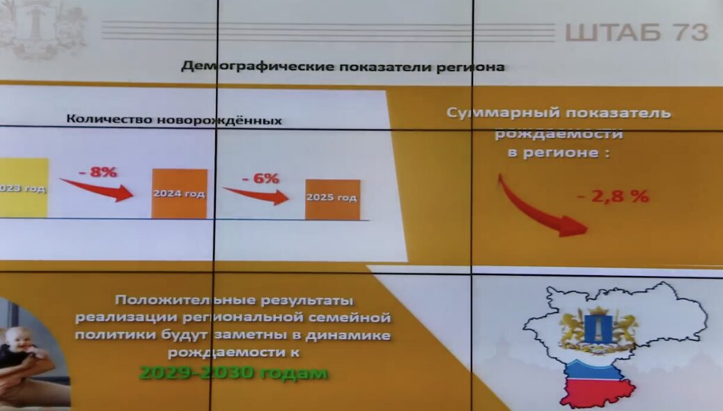 В ноябре 2025 года суммарный показатель рождаемости в Ульяновской области упал на 2,8%. В 2024 году количество новорожденных сократилось на 8% (в целом количество ульяновцев сократилось на 8000 человек), в 2025 – на 6%. Такие данные озвучил министр социального развития Дмитрий Батраков По словам чиновника, положительные результаты реализации региональной семейной политики будут заметны в динамике рождаемости к 2029-2030 гг. При этом Батраков признает, что сегодня брак утрачивает у молодежи свою значимость, и «без духовно-нравственных и семейных ценностей ни одна принимаемая органами власти мера не будет эффективной». В этой связи в Ульяновске с 20 по 22 января совместно с Симбирской епархией пройдет региональный демографический форум. В программе, в том числе, мероприятия по сплочению семей – кинопоказ и соревнования по плаванию.