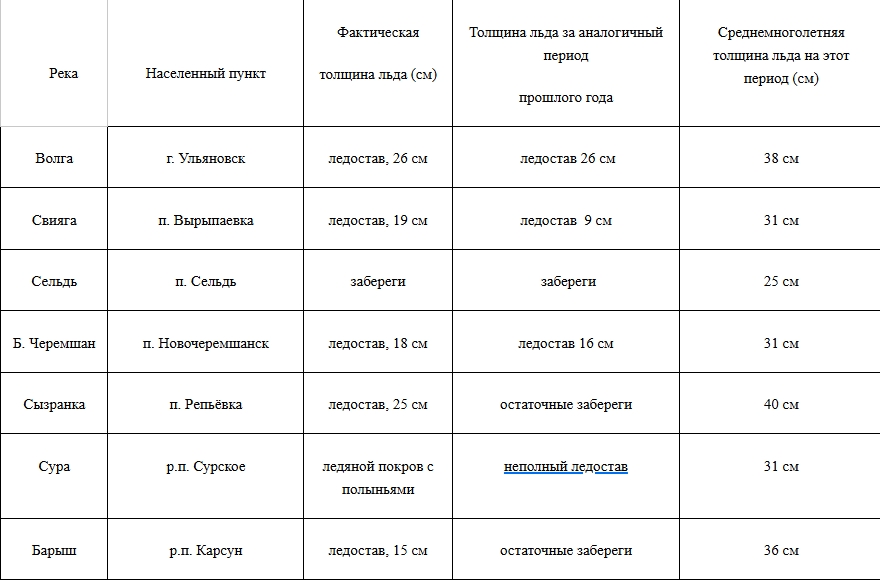 Согласно замерам, толщина льда на Волге в районе Ульяновска составляет 26 см, что значительно ниже среднемноголетних показателей в 38 см. Аналогичная ситуация наблюдается на Свияге (19 см против нормы в 31 см) и Сызранке (25 см против нормы в 40 см). Самый тонкий лед зафиксирован на реке Барыш — всего 15 см. На реке Сура сохраняется опасная обстановка: наблюдается ледяной покров с полыньями. Спасатели призывают жителей строго соблюдать меры безопасности.