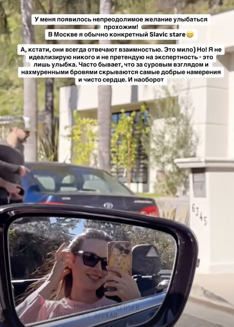 «В Москве я обычно конкретный Slavic stare. Но здесь люди всегда отвечают улыбкой, и это мило», — написала модель, добавив, что старается не идеализировать никого и не претендовать на экспертность.