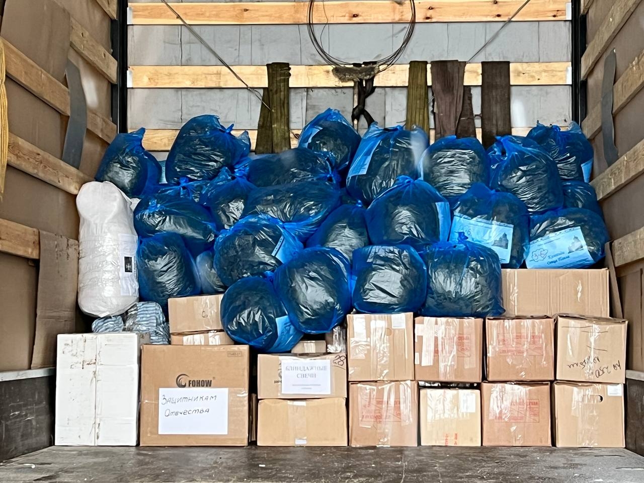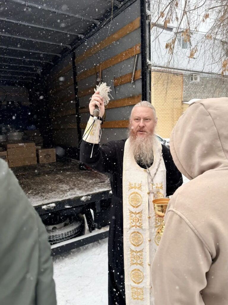 Настоятель Воскресенско-Германовского храма протоиерей Илия Кузнецов перед отправкой окропил собранный гуманитарный груз святой водой .