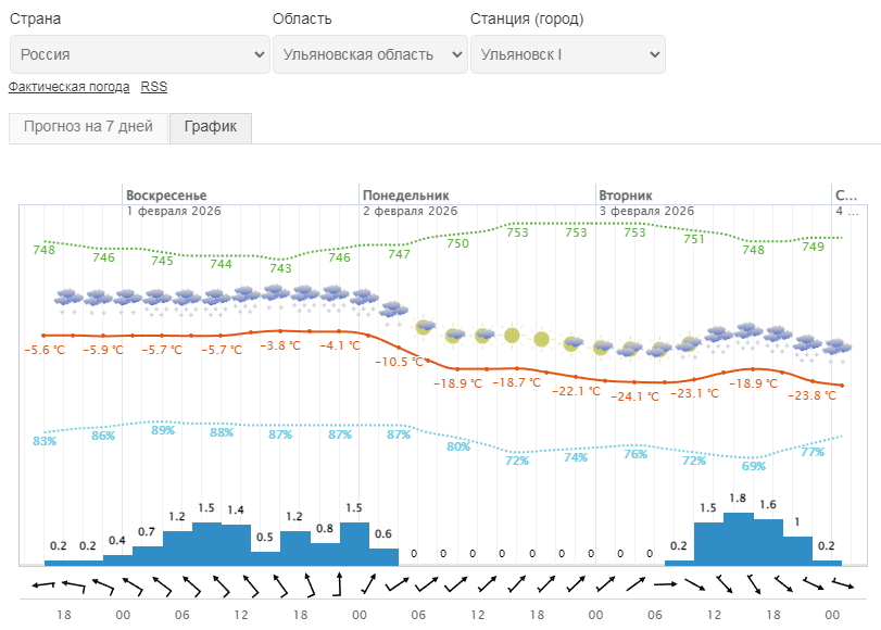 По прогнозу Гидрометцентра, ночью 1 февраля повсеместно, днем 1 февраля с сохранением ночью 2 февраля местами по Ульяновской области ожидается сильный снег, на дорогах гололедица, снежные заносы. Объявляется «желтый» уровень погодной опасности.