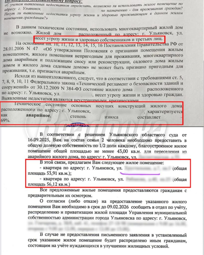 По словам женщины, предложенные властями варианты для переезда непригодны для жизни с ребенком-инвалидом. Квартиры расположены на верхних этажах без лифта, дверные проемы меньше размеров инвалидной коляски, по стенам бегают тараканы, повсюду плесень и прогнившие полы. Проблему семьи П. не решил ни выигранный суд, ни многочисленные обращения в администрацию Ульяновска. Дело уже было на контроле у главы Следственного комитета России Александра Бастрыкина, после чего местный СК возбудил уголовное дело. Но прокуратура отменила постановление, так как не увидела состава преступления, поделилась пострадавшая. Семье приходится и дальше жить в аварийном доме.