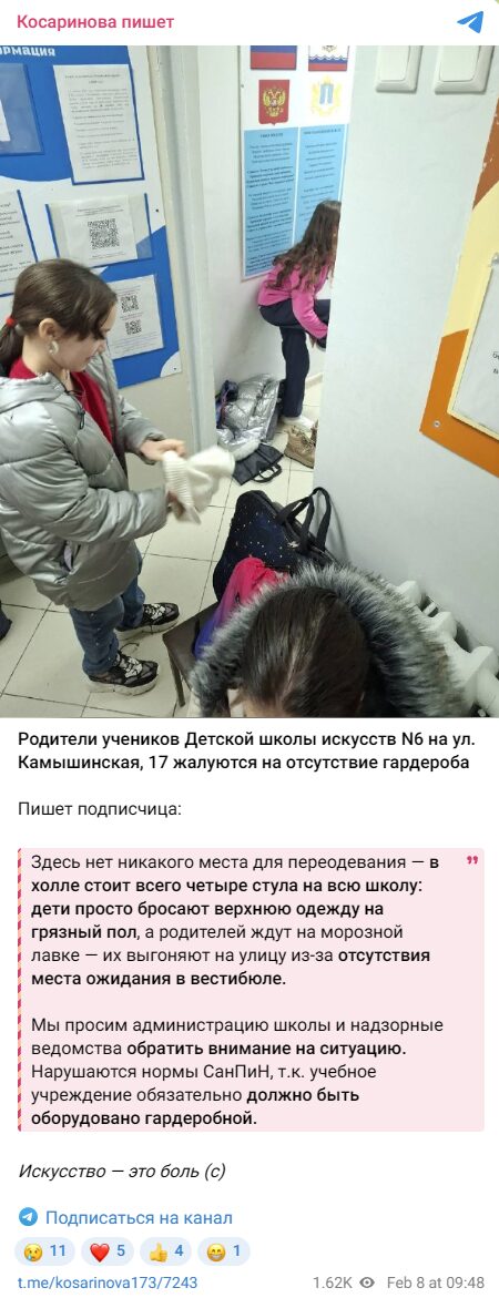— Что касается пребывания родителей внутри здания, для ДШИ действуют те же требования по пожарной безопасности и пропускному режиму, что и для общеобразовательных школ. Чем больше взрослых внутри, тем сложнее контролировать, кто находится в здании. Кроме того, в случае чрезвычайной ситуации затрудняется эвакуация, так как коридоры, холлы и вестибюль являются эвакуационными путями. Просим с пониманием отнестись к тому, что ожидание ребёнка должно проходить за пределами основного учебного пространства. Спрос на обучение детей в данном микрорайоне и именно в этом корпусе ДШИ очень высок. Отдать целый учебный кабинет под обустройство отдельного гардероба означало бы существенно сократить приём детей в школу и уменьшить количество обучающихся, — отметили в Управлении культуры.