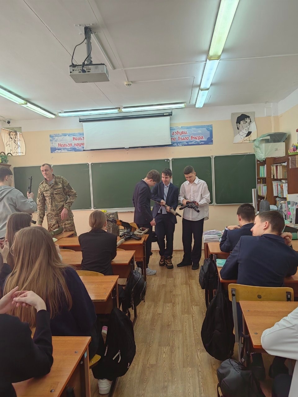 — Главная цель такой встречи — донести до учащихся мысль о том, как важно сохранение мира, за который сегодня борются наши ребята в непростых условиях. Школьники с интересом посмотрели оружие и смогли подержать его в руках, соблюдая правила безопасности. Возможность прикоснуться к подлинным свидетельствам специальной военной операции произвела на ребят сильное впечатление, — рассказал Юрий Савинцев.