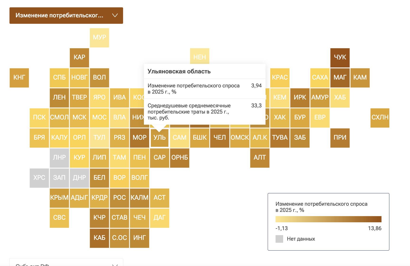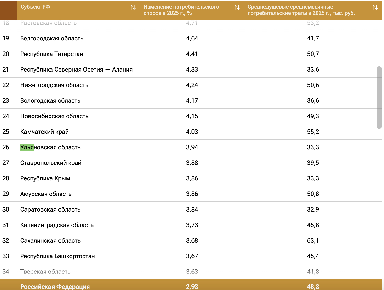 Ульяновская область расположилась на 26-й строчке рейтинга российских регионов по динамике потребительского спроса в 2025 году. Исследование подготовлено РИА Новости.