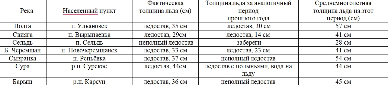 р. Волга (г. Ульяновск): ледостав, толщина льда составляет 35 см (что выше прошлогоднего показателя в 28 см, но ниже нормы в 57 см).