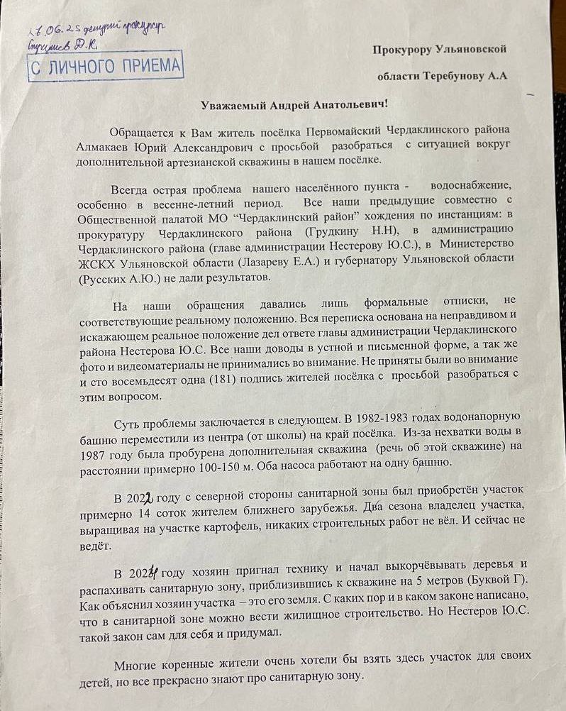 «Земельная болезнь» Чердаклинского района, о которой мы писали на примере села Красный Яр, оказалась заразной. Вслед за красноярцами к прокурору области Андрею Теребунову обратились жители поселка Первомайский. Сценарий один и тот же: дефицит воды, сомнительная раздача земель в санитарных зонах и странные ответы главы администрации района Юрия Нестерова. Житель поселка Юрий Алмакаев на личном приеме передал прокурору области жалобу, под которой подписался 181 человек. Суть конфликта: в поселке, страдающем от нехватки воды, есть дополнительная артезианская скважина. Однако чиновники, по словам жителей, продали землю вокруг нее (санитарную зону) частному лицу, а саму скважину объявили нерабочей. Глава администрации Нестеров в ответах утверждает: скважина заилена, экономически невыгодна и не работает с 1980 года. Жители решили проверить слова чиновника и провели следственный эксперимент. Факт №1: Когда из «нерабочей с 80-х годов» скважины достали насос, на нем обнаружили дату выпуска — 2016 год. Факт №2: Жители своими силами подключили оборудование в июне 2024 и 2025 годов. Скважина выдала мощный напор чистой, прозрачной воды. Люди уверены: источник «хоронят» на бумаге, чтобы оправдать продажу участка в санитарной зоне. Новый владелец земли уже начал распахивать территорию в 5 метрах от скважины. Ситуация в Первомайском как две капли воды похожа на происходящее в соседнем Красном Яре. Напомним, там жители уже больше года бьются за свои скважины (№ 2603, 2604), земли вокруг которых также были розданы под застройку. Там тоже фиксировались попытки строительства в санитарной зоне, демонтаж ограждений и угроза водоснабжению целого села. Жители обоих поселков задают прокурору один вопрос: почему в Чердаклинском районе земли вокруг стратегически важных объектов водоснабжения систематически уходят в частные руки, а интересы сотен семей игнорируются. |