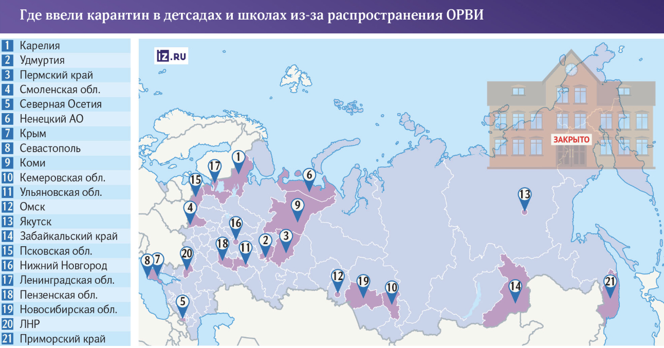 Ульяновская область вошла в число 20 субъектов РФ, где из-за всплеска ОРВИ и гриппа начались массовые закрытия образовательных учреждений. Как сообщают «Известия», на текущей неделе в нашем регионе, наряду со Смоленской и Омской областями, зафиксировано как частичное (по классам), так и полное закрытие школ и детсадов на карантин. Согласно данным Роспотребнадзора, по всей стране за неделю заболеваемость выросла на 4,5%. Доминирующим штаммом остается гонконгский грипп, однако нынешнюю волну в конце февраля также подстегивает риновирусная инфекция. Специалисты отмечают, что образовательный процесс в школах Ульяновска и области приостанавливается точечно — в тех случаях, когда на занятия не приходят более 20% учеников. По прогнозам экспертов, пик этой волны заболеваемости придется на первую-вторую неделю марта. Этому способствует неустойчивая погода с температурными качелями, которая «консервирует» вирусы в воздухе. Инфографика: Известия |