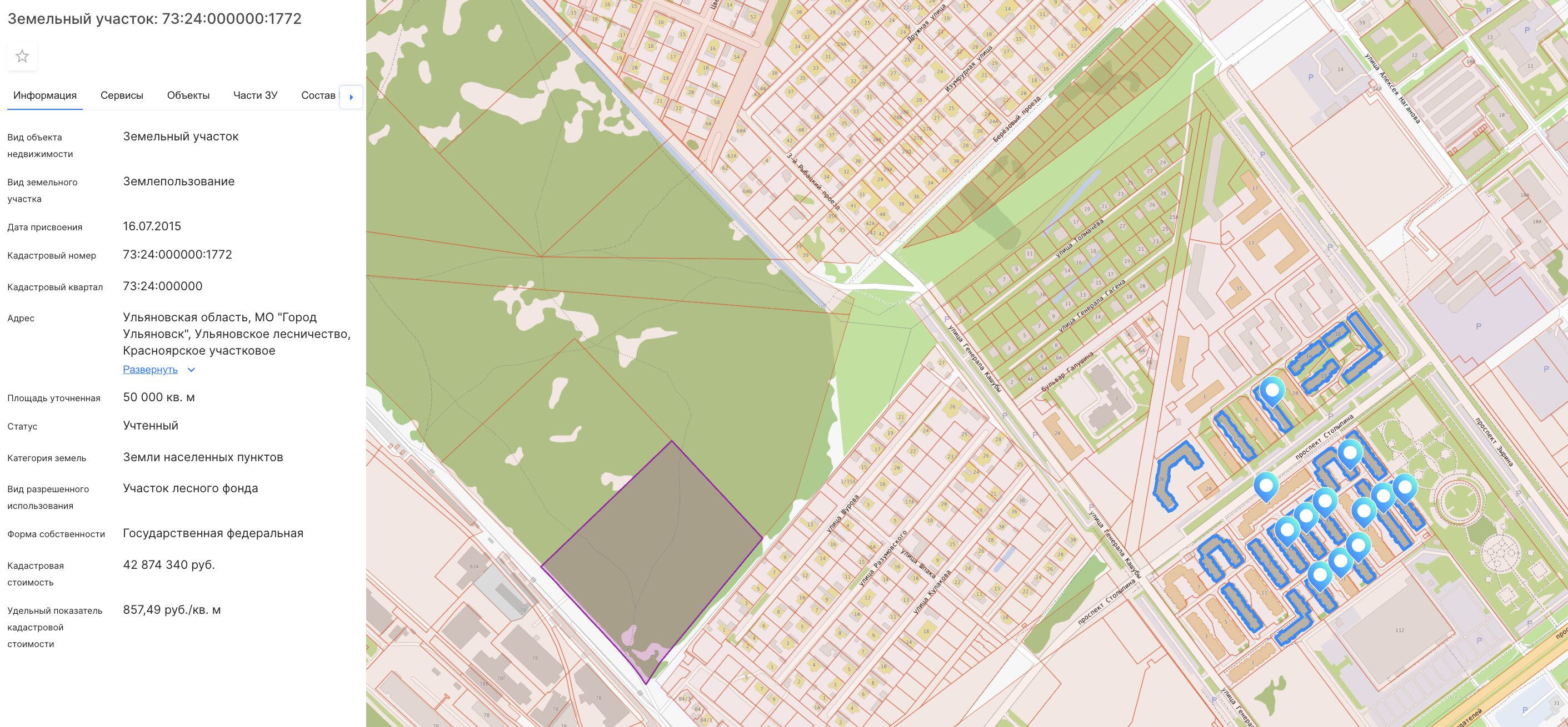 Микрорайон «Волжские кварталы» и один из участков лесного фонда рядом, скрин с публичной кадастровой карты