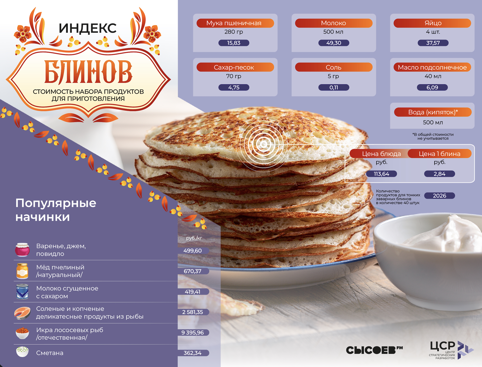Согласно отчету ЦСР, в этом году главное масленичное блюдо подешевело впервые за последние годы – на 4,7% по сравнению с 2025-м. Основной вклад в снижение внесли яйца (минус 20%) и сахар-песок (минус 8,5%), что компенсировало рост цен на другие ингредиенты, не превысивший уровень инфляции. Стандартный рецепт включает 280 г муки пшеничной, 500 мл молока, 4 яйца, 70 г сахара, 5 г соли и 40 мл подсолнечного масла. В Ульяновской области молоко и яйца, составляющие львиную долю затрат (49,30 и 37,57 рубля соответственно в среднем по России), оказались особенно выгодными.