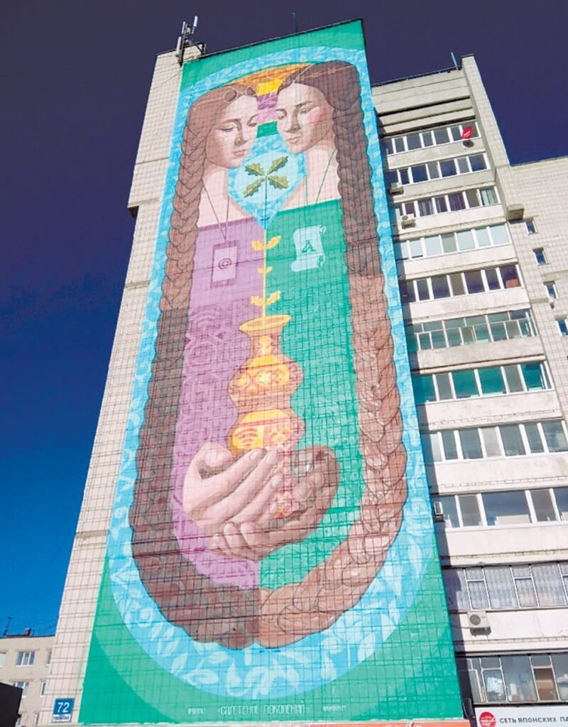 Дом №72 по ул. Рябикова прославился тем, что в 2020 году на его фасаде появился на тот момент самый большой в Ульяновске мурал под названием «Сплетение поколений». А сейчас МКД и сам начал выбираться из 90-х, преодолевая прежние представления о том времени, когда все рушилось и разваливалось