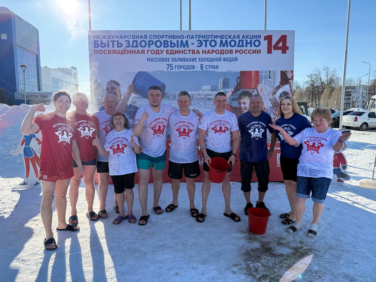 Международная спортивно-патриотическая акция «Быть здоровым — это модно!», главной идеей которой является массовое обливание холодной водой, в четвертый раз прошла в Ульяновске на площади перед ледовым дворцом «Волга-Спорт-Арена». Участниками акции стали десятки горожан.
