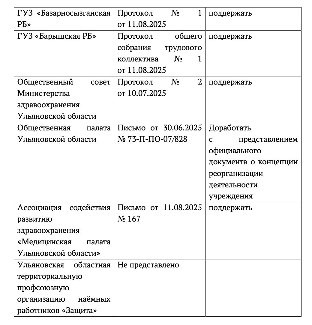 Неизвестно, представлял ли Минздрав затребованную общественниками концепцию. Тогда  было сравнение медсети двух районов. В Базарносызганском это 17 ФАПов и больница, в Барышском – 3 амбулатории, Центр амбулаторной онкологической помощи, 32 фельдшерско-акушерских пункта и больница. В качестве дополнительного аргумента для объединения называлось то, что «укрупнение медицинских организаций государственной сети здравоохранения – это общефедеральная тенденция» и «подобные реорганизационные мероприятия прошли во всех субъектах РФ».
