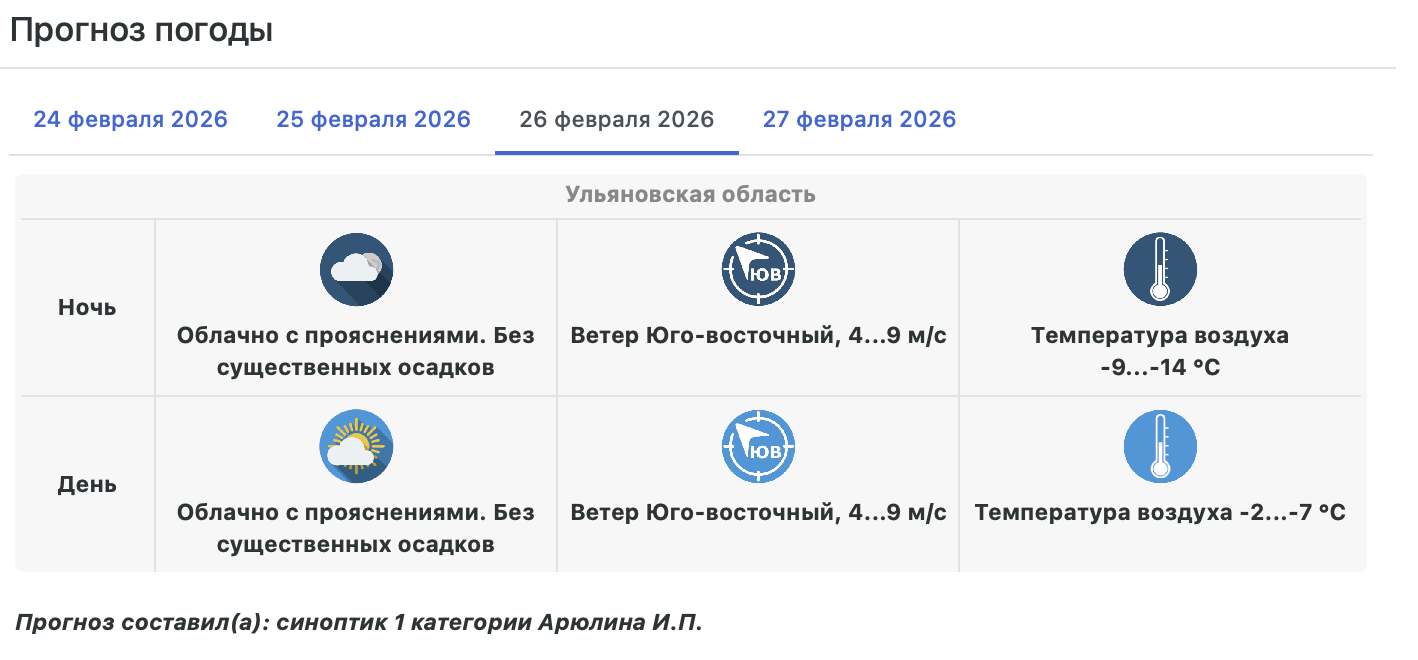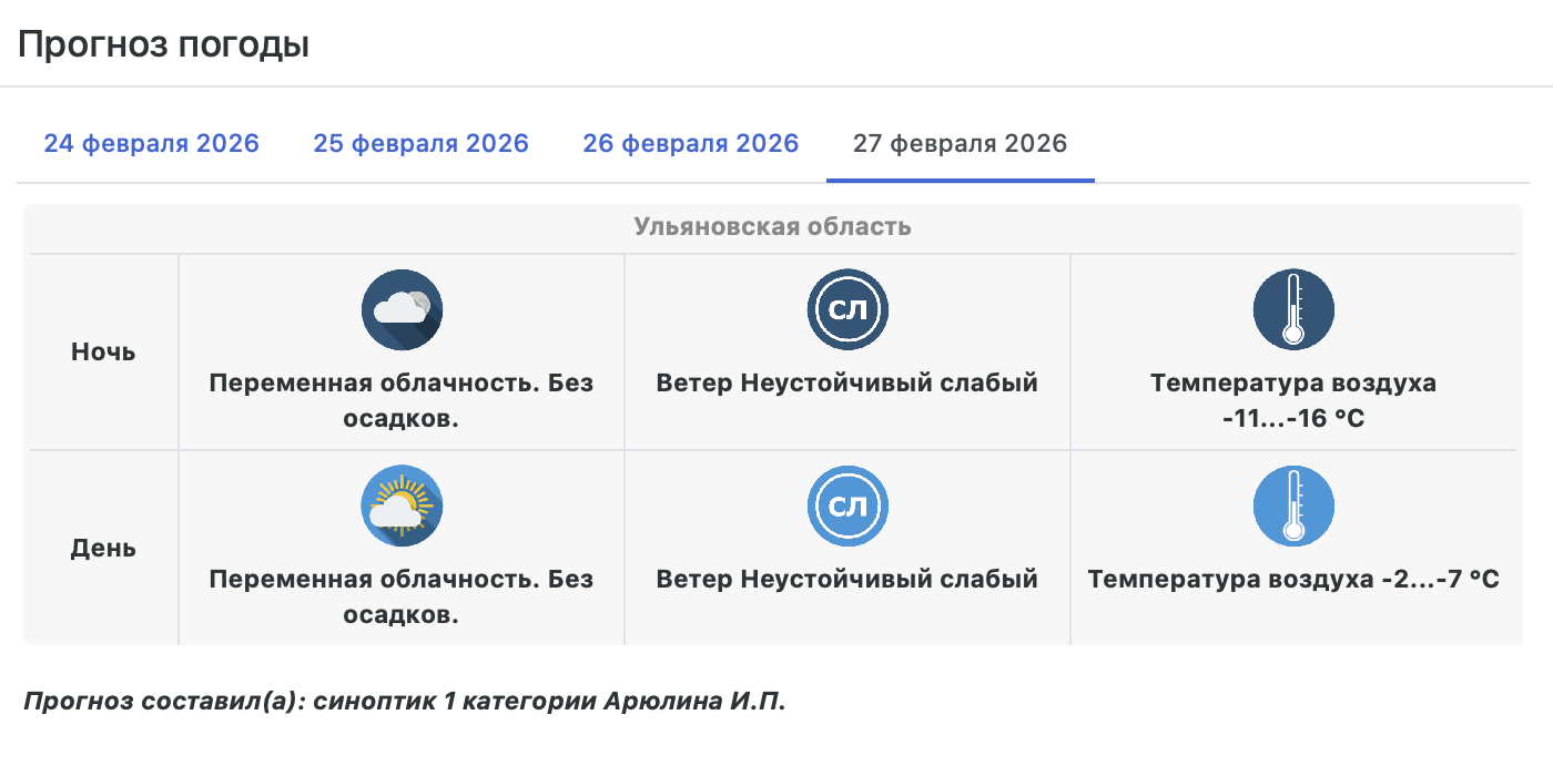 По прогнозу Гидрометцентра в первой половине рабочей недели Ульяновская область будет находится под влиянием области повышенного давления. В большинстве районов сохранится погода без существенных осадков, лишь по северо-западным районам области в среду и четверг, 25-26 февраля, ожидается снег от небольшого до умеренного.