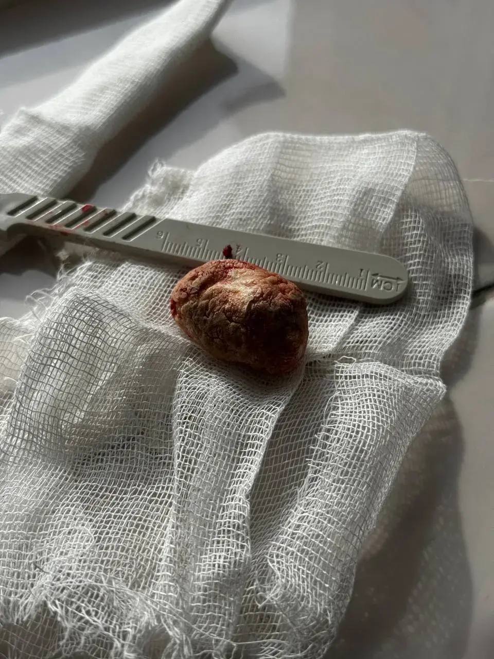 В ходе операции медики извлекли камень размером 3,5х2 см. Для сравнения: обычно протоки закупориваются образованиями величиной всего в пару миллиметров, что вызывает невыносимую боль. Однако в данном случае камень располагался так удачно, что долгое время не перекрывал отток слюны, продолжая увеличиваться в объеме.