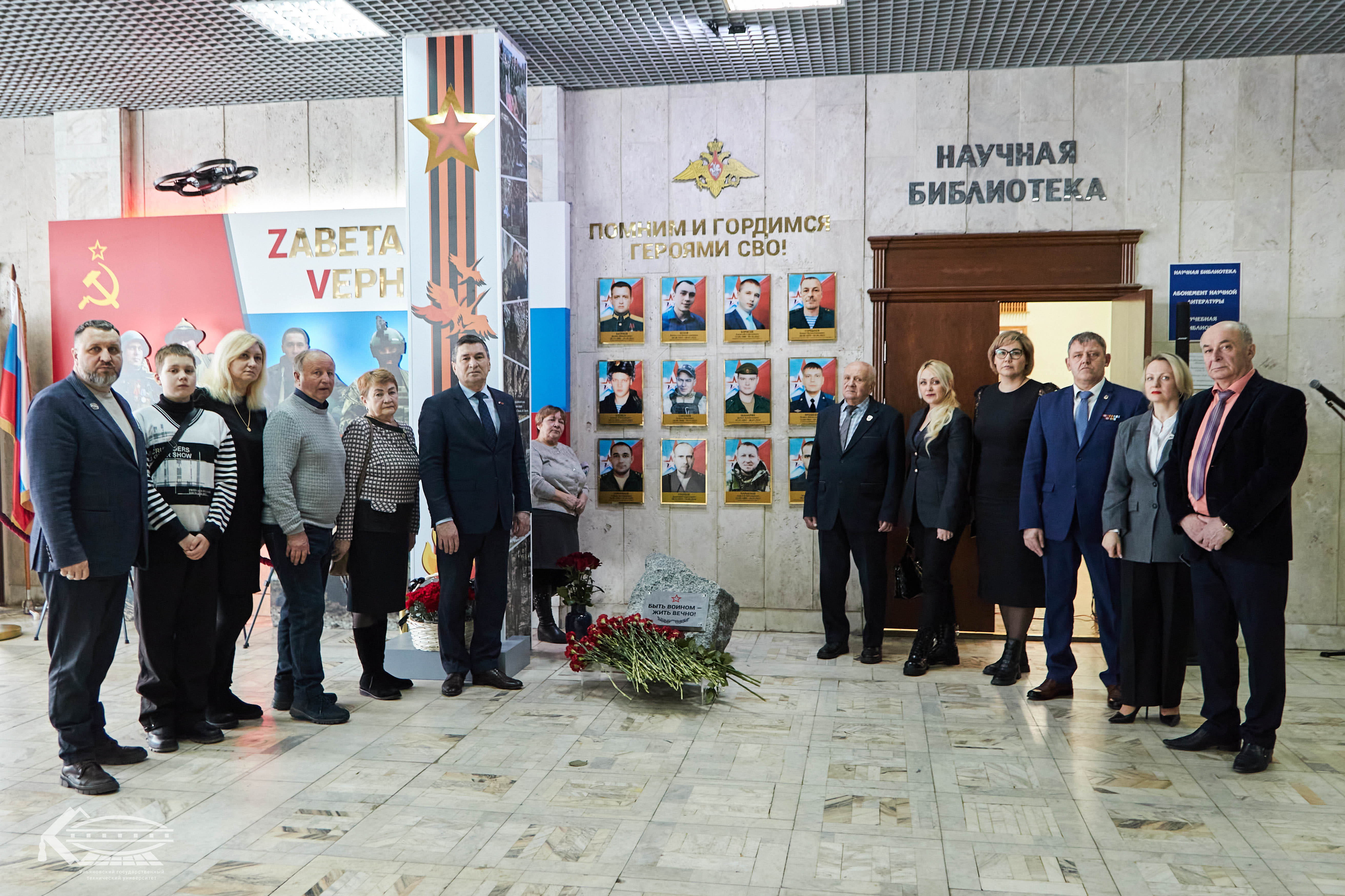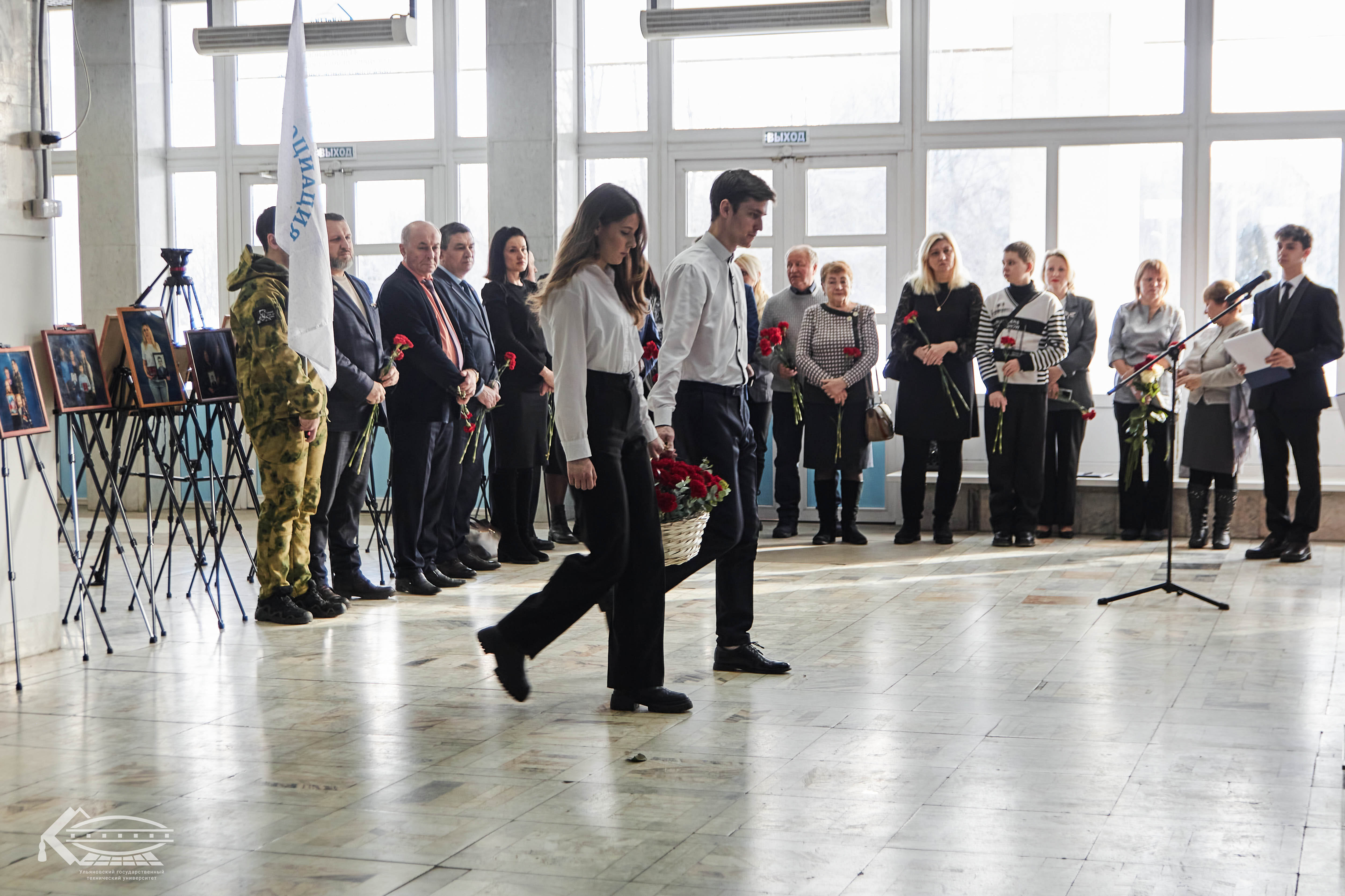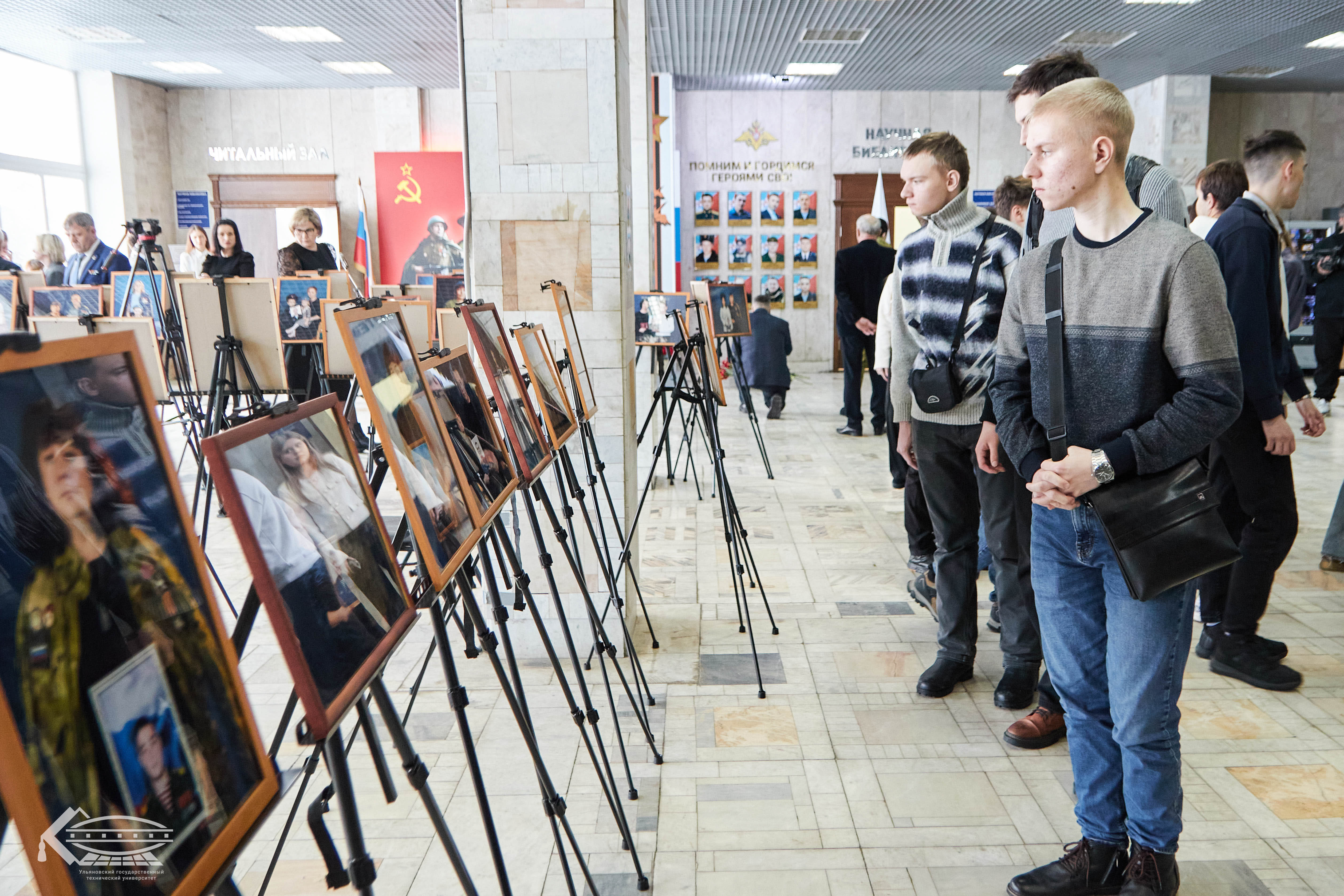 В холле университета развернулась фотовыставка «Семьи Героев» — проект, реализуемый Общественной палатой Ульяновска с 2023 года. Экспозиция, которая начала свой путь в киноконцертном комплексе «Современник» уже побывала в разных районах города, и в этот раз предстала в стенах Политеха в расширенном формате: 55 фотопортретов, на которых родители, жены, дети и сестры держат в руках изображения своих погибших защитников.