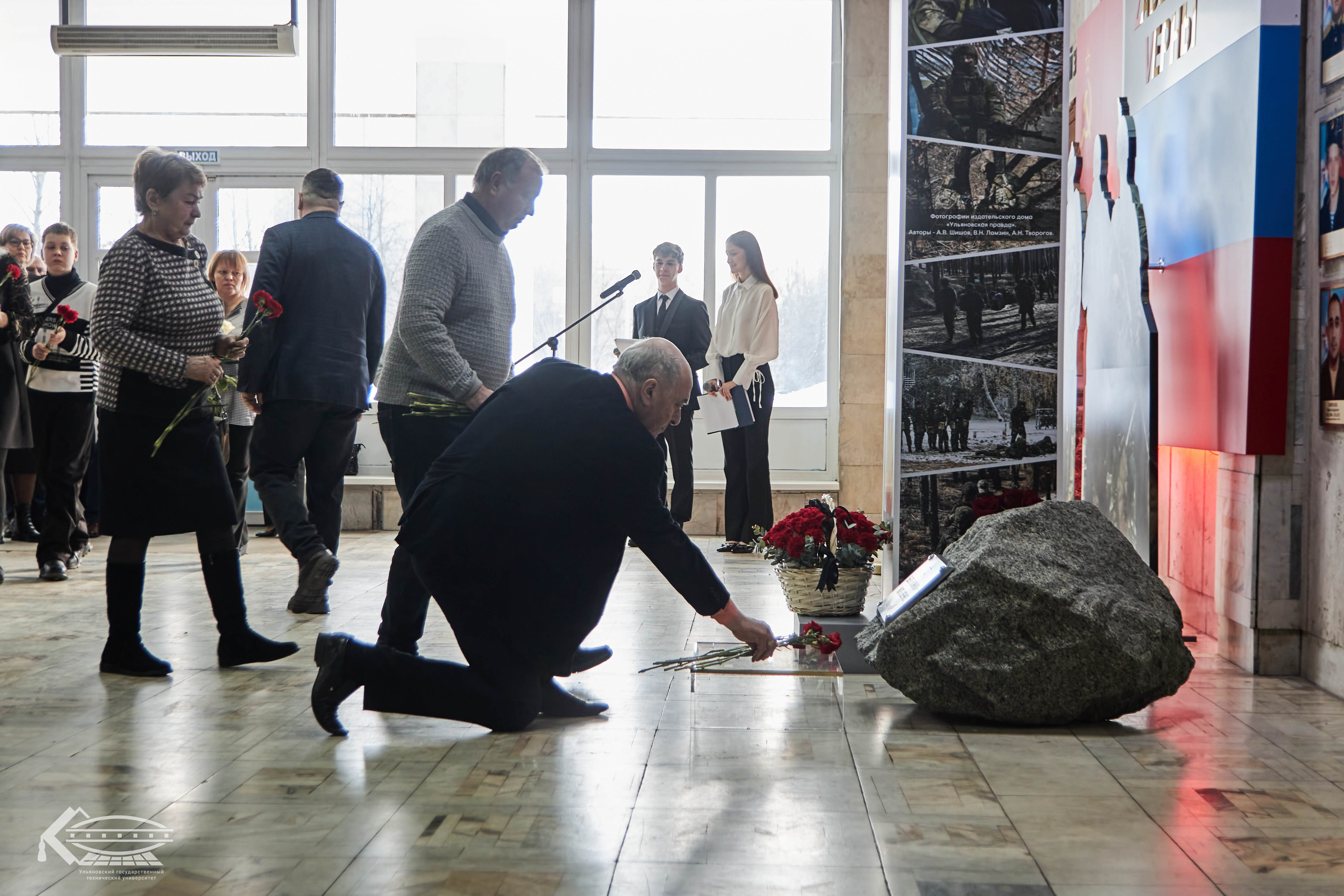 «Мы с большим уважением относимся к соотечественникам, кто защищает Родину. На нашей стене памяти — Герои специальной военной операции, которые связаны с УлГТУ: выпускники колледжа экономики и информатики, различных факультетов и сотрудники. Сегодня мы увековечили память выпускников — мы будем помнить их всегда. На мемориальном камне написан очень символичный лозунг — «Быть воином — жить вечно». Поэтому они, безусловно, всегда будут жить в наших сердцах», — подчеркнул проректор по режиму и безопасности УлГТУ Леонид Ямпольский.