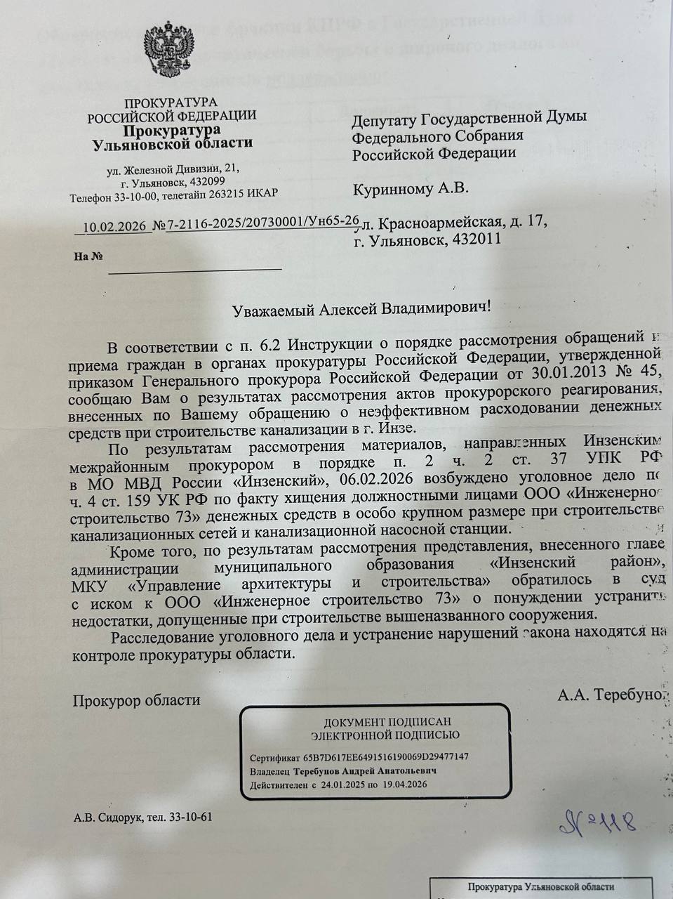 В Ульяновской области снова срывается проект, реализованный по программе «Чистая вода». Депутат Госдумы Алексей Куринный сообщил о проблемах с новым водоводом до Чердаклов, Октябрьского и Мирного. Работы обошлись в общей сложности в более чем 300 млн рублей. Однако местные жители пожаловались, что сейчас система не работает. Причины сбоя назвать никто не может – депутат написал заявление в прокуратуру. Сельчане рассказали Алексею Куринному, что систему сначала запустили, она поработала три месяца и ее отключили: