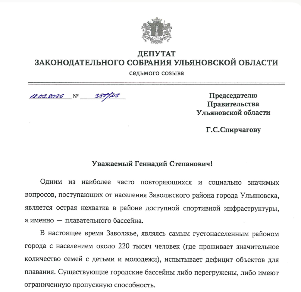 В Заволжском районе Ульяновска назрела острая необходимость в строительстве новой водной спортивной инфраструктуры. С официальным обращением к Председателю Правительства региона Геннадию Спирчагову по этому поводу выступил депутат Законодательного Собрания области Роман Султашов.