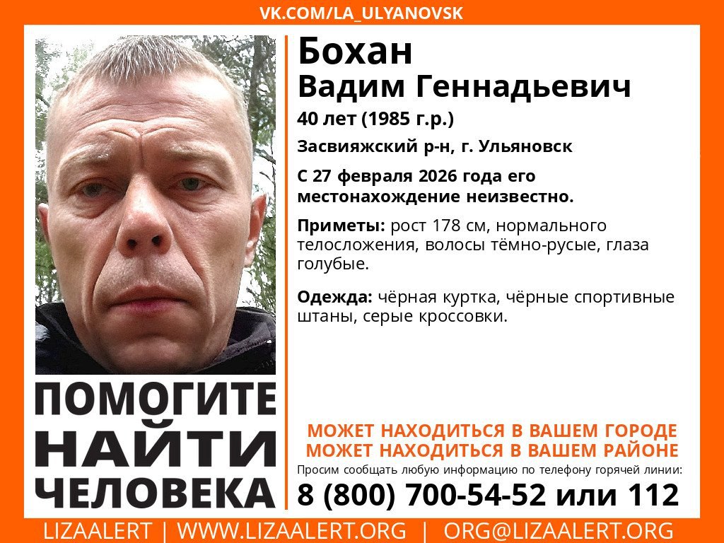 Волонтеры поискового отряда «ЛизаАлерт» распространили ориентировку на жителя Засвияжского района. Бохан Вадим Геннадьевич 1985 года рождения перестал выходить на связь с близкими 27 февраля 2026 года. С тех пор его местонахождение остается неизвестным.