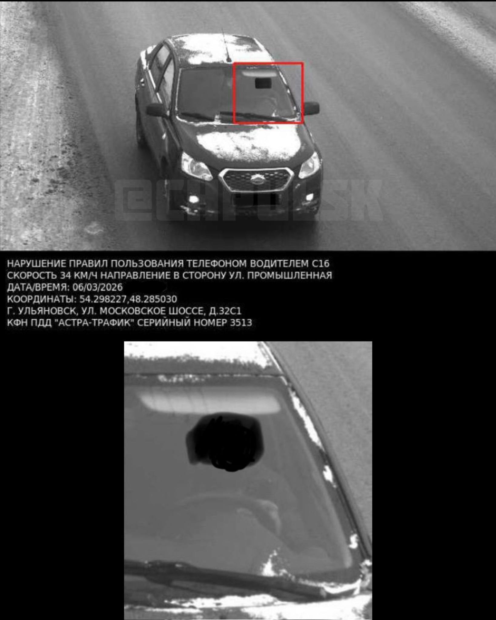 На одном из опубликованных снимков зафиксировано нарушение на Московском шоссе в районе дома №32. Комплекс фотофиксации «Астра-Трафик» четко запечатлел водителя автомобиля Datsun с гаджетом в руках. Примечательно, что камера срабатывает даже при невысокой скорости движения (в данном случае — 34 км/ч).