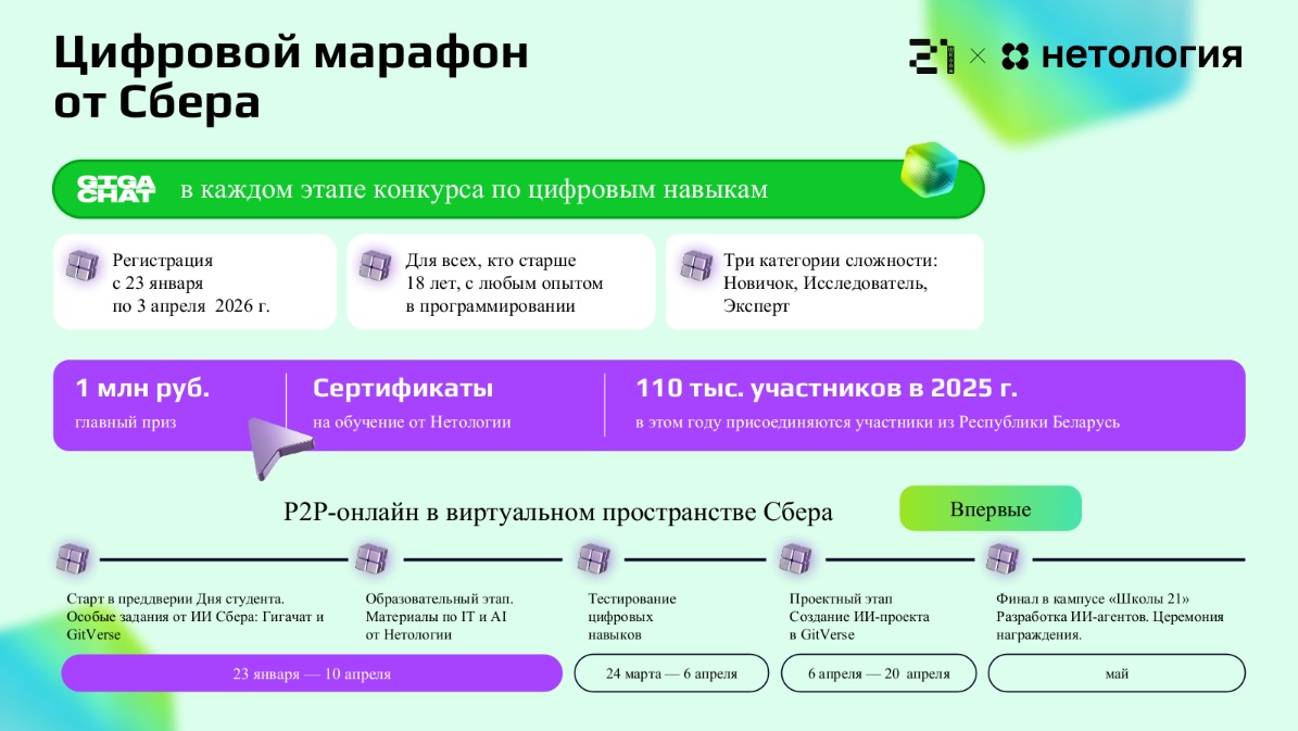 В конкурсе «Цифровой марафон» уже зарегистрировались десятки тысяч участников из 89 регионов страны. Наибольшее количество заявок поступило из Москвы и Московской области, Санкт-Петербурга, Краснодарского края, а также Свердловской, Нижегородской и Новосибирской областей. Регистрация продлится до 3 апреля 2026 года.