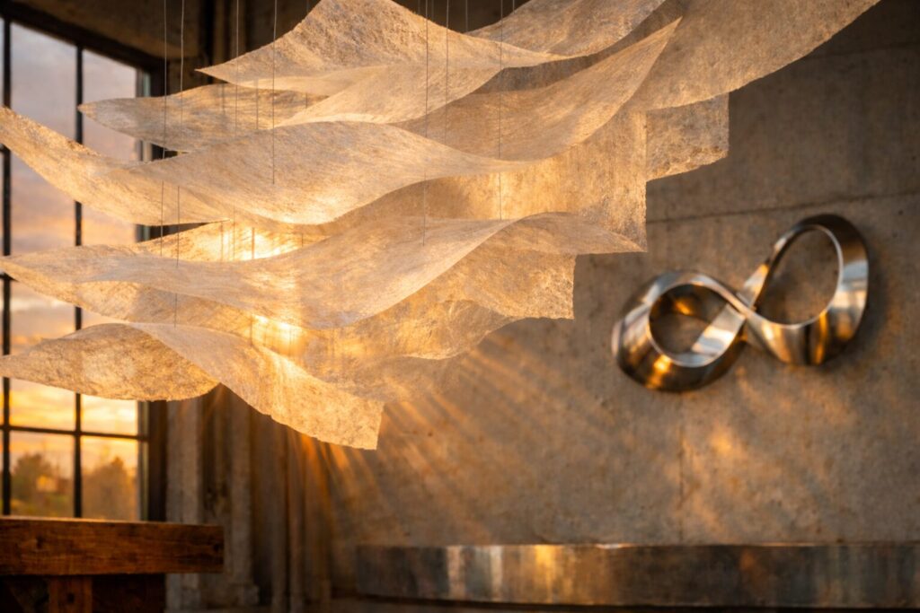 Многое изменила поездка в Японию. Горшкова познакомилась с мастерами оригами и философией «ваби-саби» и увидела, как обычный лист бумаги может организовать пространство. Вернувшись, она придумала свою технику: собирает конструкции без клея, только за счет сгибов и переплетений. Инсталляция «Лабиринт времени» из рисовой бумаги меняется от малейшего движения воздуха. Получается, что зритель сам становится частью работы.