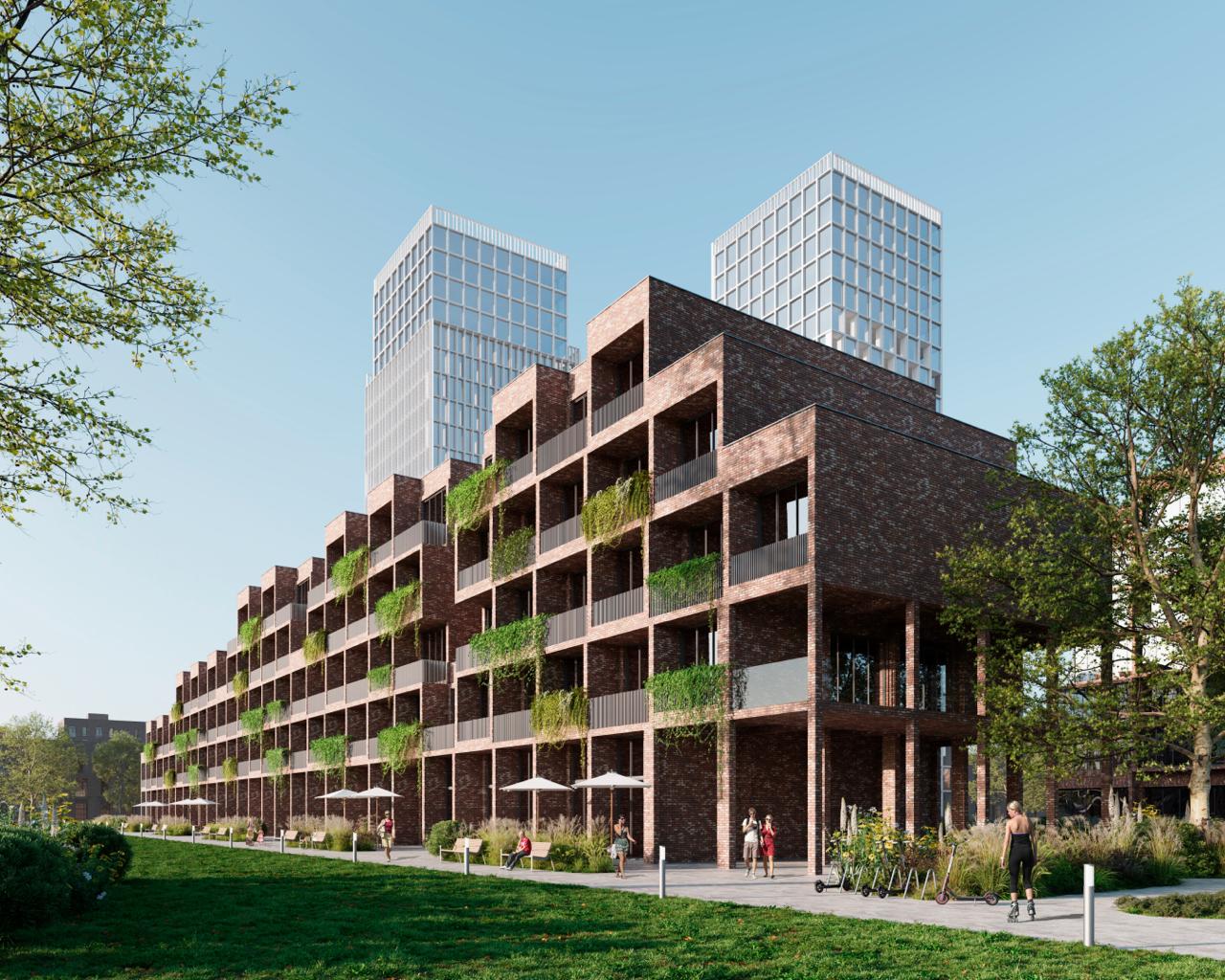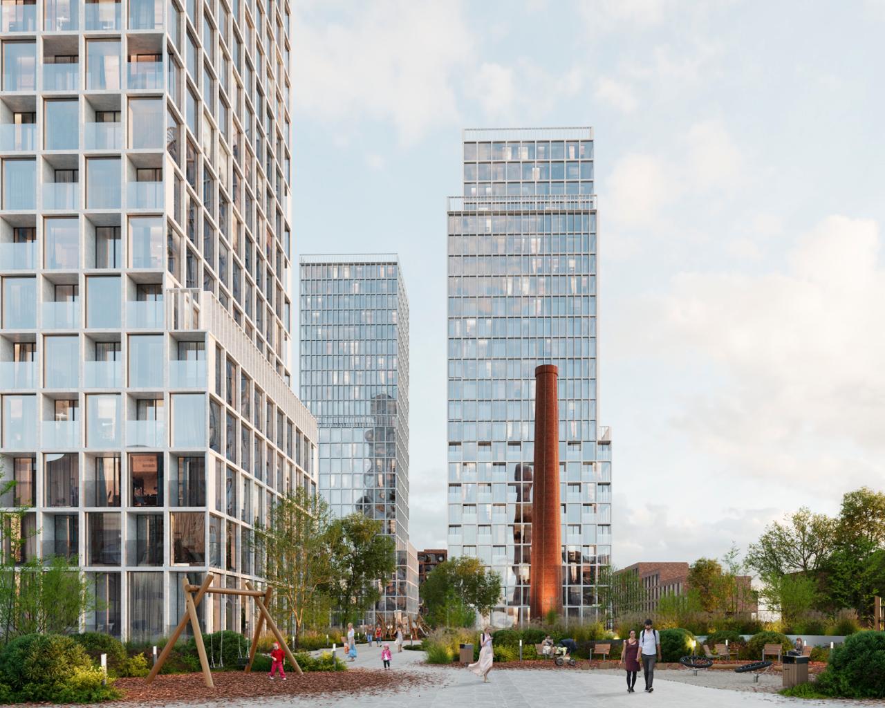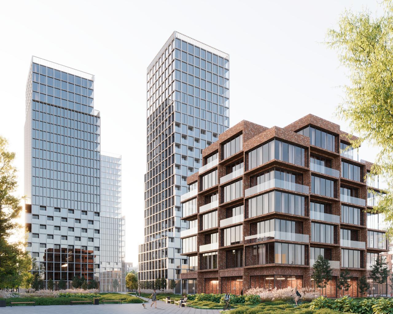 Вторым слоем станут высотные башни. Благодаря ступенчатой пластике и террасам они не будут выглядеть монолитными. Фасады небоскребов выполнят из стекла и металла, что создаст контраст с «тактильным» кирпичным основанием квартала.