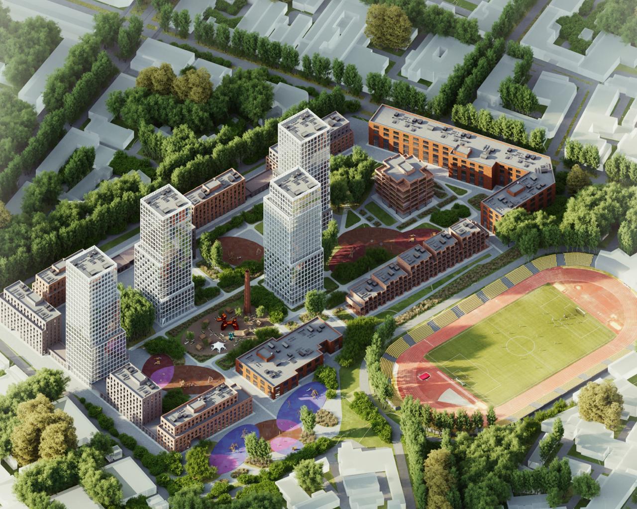 Архитекторы не стали изолировать жилье от соседнего стадиона «Труд». Напротив, часть квартир будет ориентирована окнами на поле. Для защиты от шума применят «архитектурную фильтрацию» — специальную рифленую геометрию фасадов и лоджии-буферы. Центром жизни квартала станет сохраненная труба бывшей котельной. Вокруг этого вертикального ориентира обустроят площадь, фудкорт и коворкинг. За счет сдвига высотных башен единое пространство двора разделят на несколько уютных зон с разной степенью приватности.