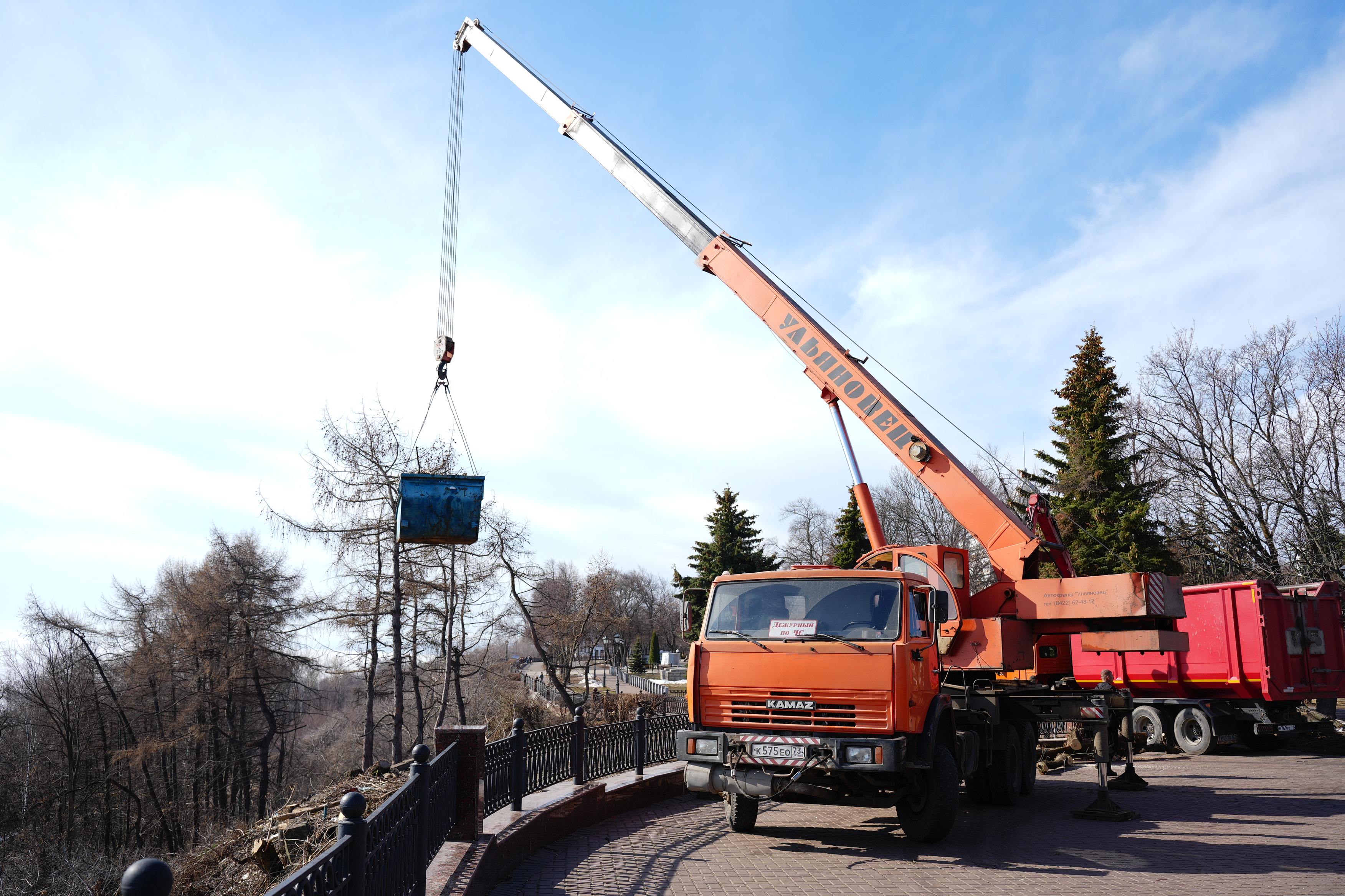 На Волжском косогоре сейчас задействованы 10 сотрудников «Управления гражданской защиты». Процесс организован в несколько этапов: спасатели вручную собирают порубочные остатки в 8-кубовые контейнеры, которые затем с помощью автокрана поднимают на бульвар Новый Венец. Там древесные отходы перегружают в ломовозы и самосвалы для дальнейшего вывоза.