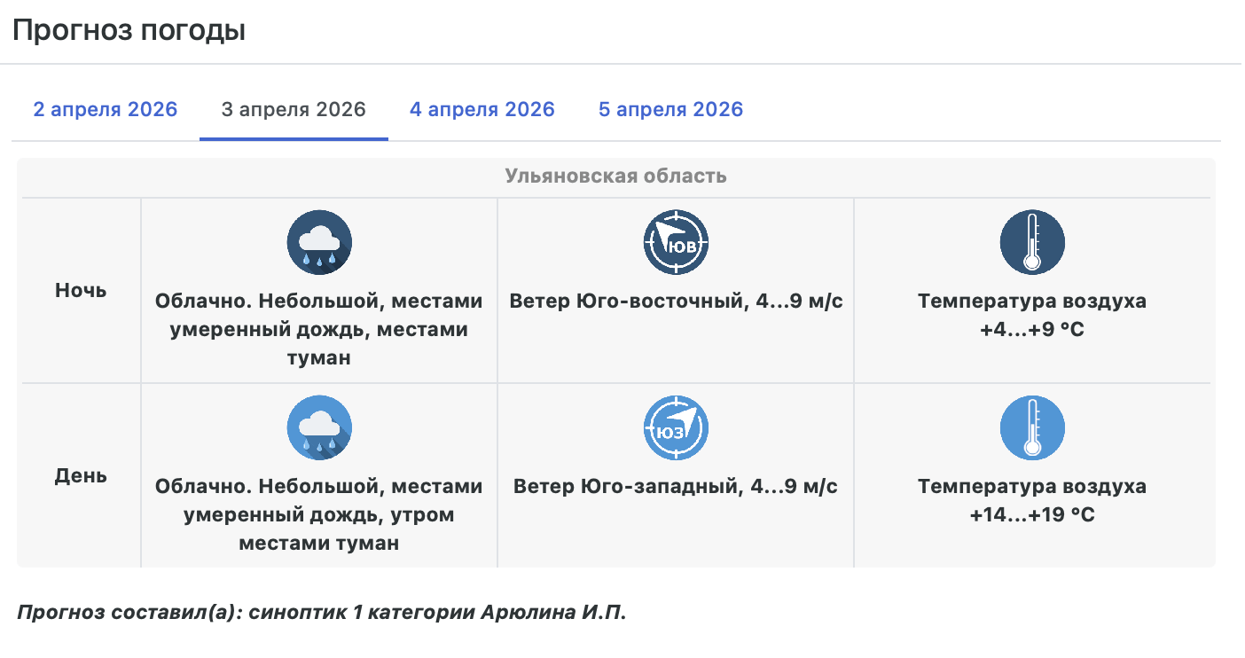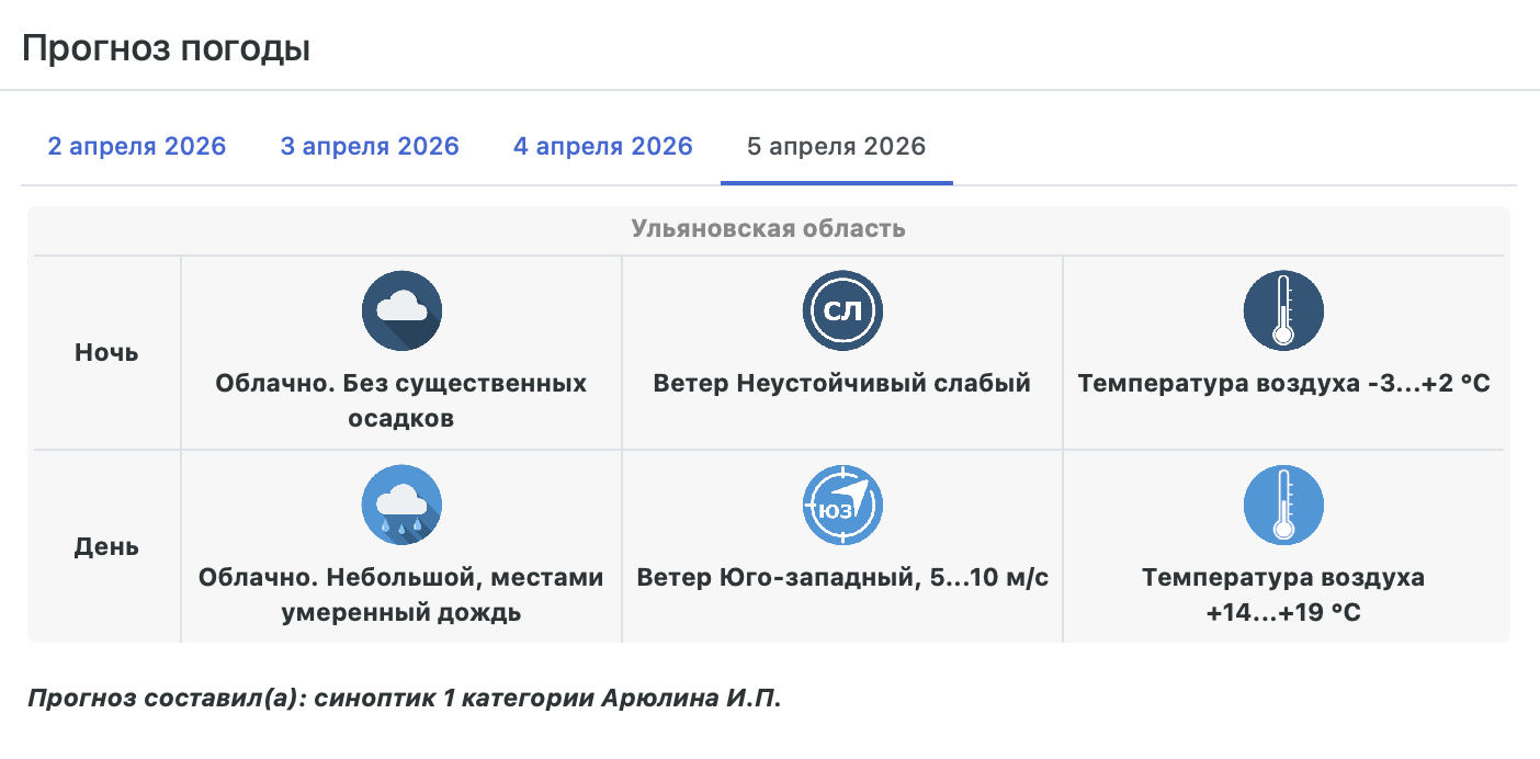 По прогнозу Гидрометцентра по Ульяновской области сегодня, 2 апреля, давление в регионе стало понижаться, область оказалась под влиянием ложбины циклона. В вечеру среды и до конца недели ожидается дождь различной интенсивности.