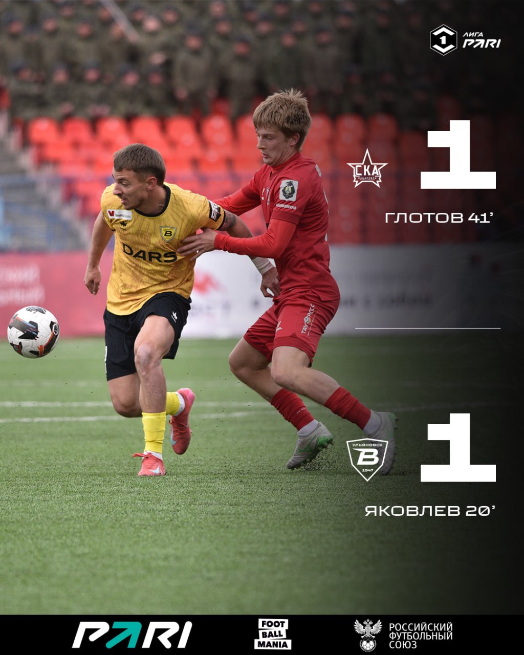Ульяновская «Волга» и «СКА-Хабаровск» не выявили победителя в матче футбольной Первой лиги. Встреча в Хабаровске завершилась со счетом 1:1, у желто-черных отличился Владислав Яковлев (20).