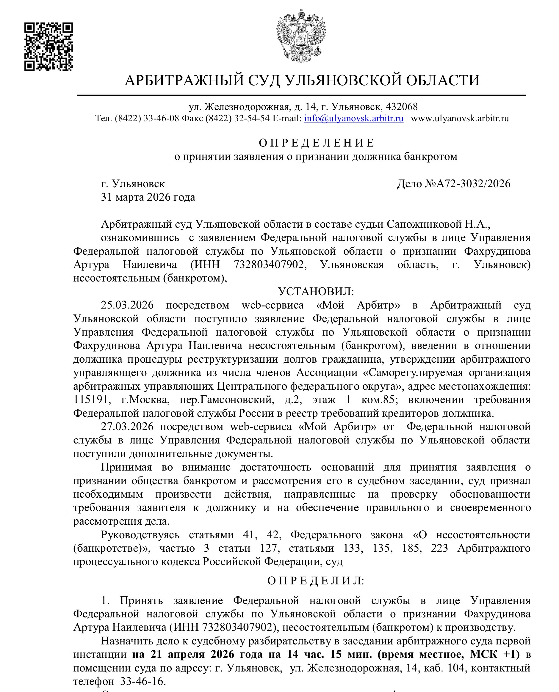 Пока дело оставлено без движения до 8 мая.