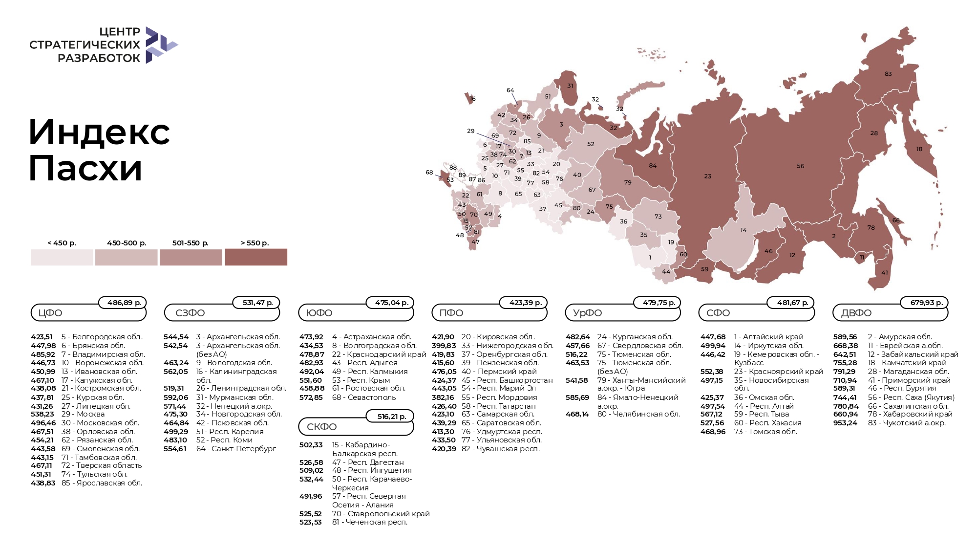 В ЦСР отмечают, что снижение стоимости пасхального набора зафиксировано в 50 российских регионах. Сильнее всего он подешевел в Алтайском крае (на 7,2%), Тверской и Свердловской (на 7%), Ленинградской (на 6,8%) и Вологодской (на 6,6%) областях.