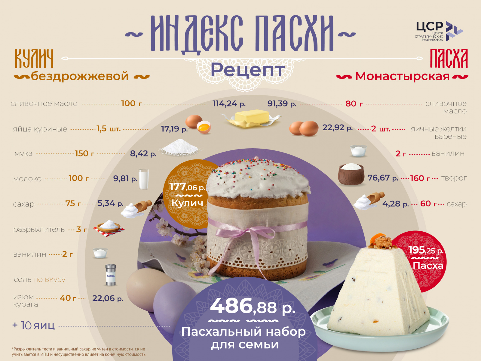 При расчете учитывались стоимость ингредиентов по регионам России для приготовления пасхального стола на 4 порции — кулич, яйца и творожная пасха.