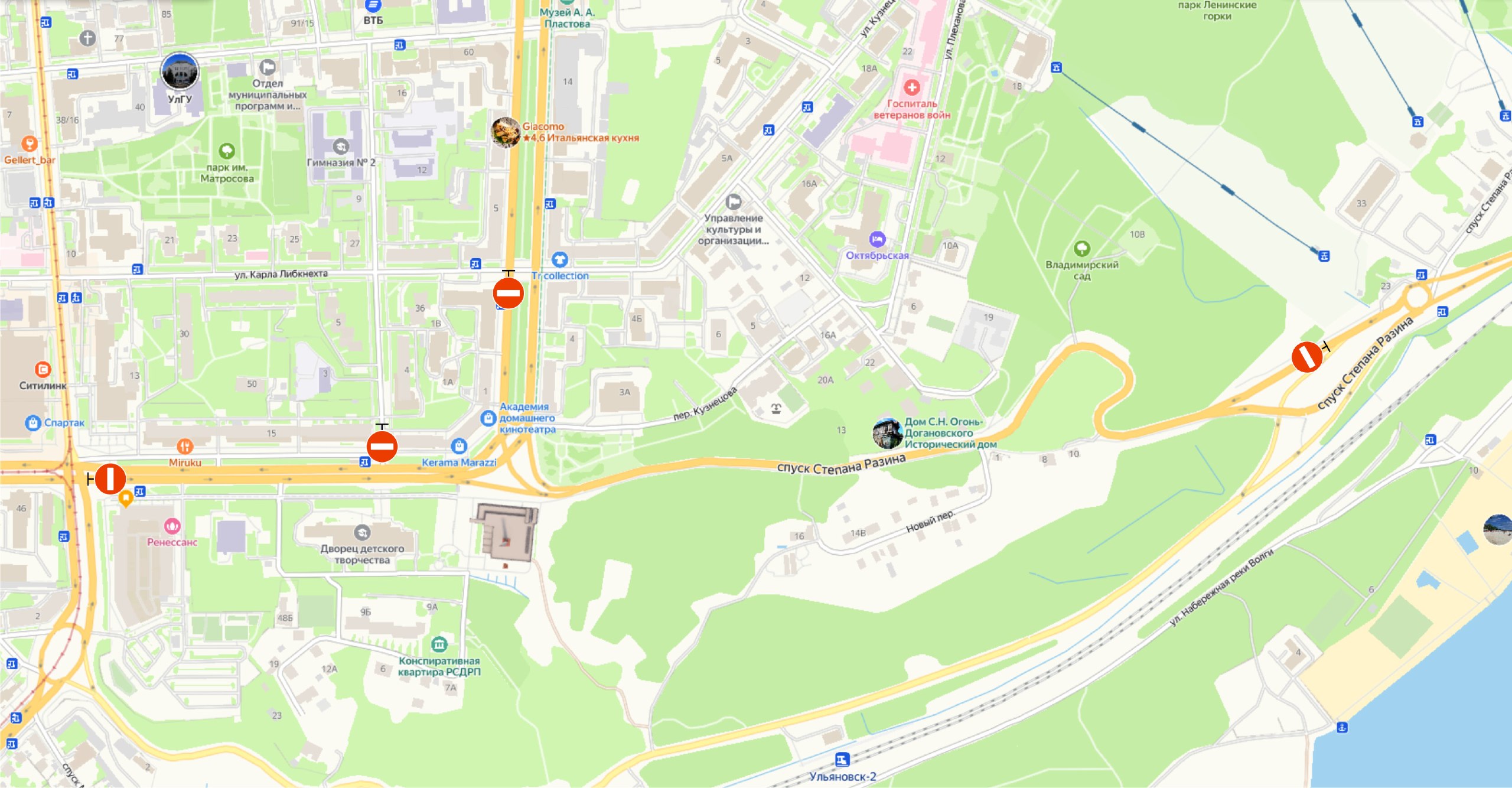 спуск Степана Разина — от площади 30-летия Победы до дома № 23, с перекрытием переулка Нового.
