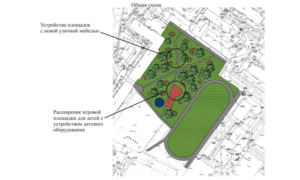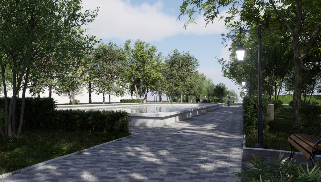 Проектом предлагается восстановить пешеходно-тропиночную сеть, обустроить освещение, установить скамейки и урны и отремонтировать фонтан.