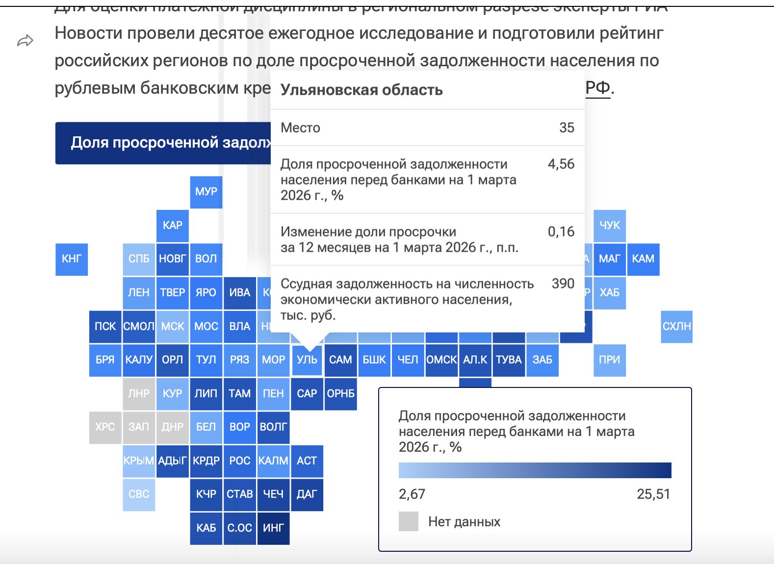 «РИА Новости» опубликовали рейтинг регионов, где живут самые дисциплинированные заемщики. Ульяновская область заняла в нем 35 строчку. По данным исследования, в регионе не платит по кредитам 4,56% населения. В среднем каждый экономический активный ульяновец должен банкам 390 тысяч рублей. Как отмечают аналитики агентства, розничное кредитование в 2025 году практически обнулилось из-за высоких процентных ставок в экономике. Рекордно высокие ставки привели к переоценке доступных кредитных лимитов и замедлили годовые темпы роста потребительского кредитования до 3% по состоянию на 1 октября 2025 года, что стало минимальным показателем с 2016 года. Однако во второй половине 2025 года ситуация стала улучшаться, ставки начали снижаться, и уже по итогам года рост портфеля кредитов, выданных физическим лицам, увеличился до 5,9%, а на 1 марта 2026 года – +7,2%. |