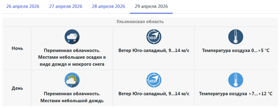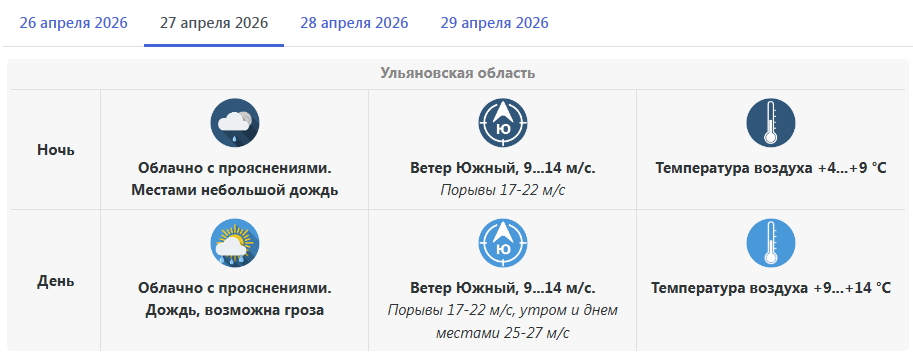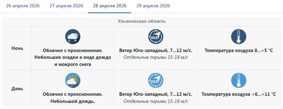 По прогнозу Гидрометцентра, в начале рабочей недели Ульяновская область будет находиться под влиянием череды западных циклонов. В понедельник, 27 апреля, при прохождении атмосферных фронтов на территории региона ожидается дождливая ветреная погода. Ночью местами возможно выпадение мокрого снега.