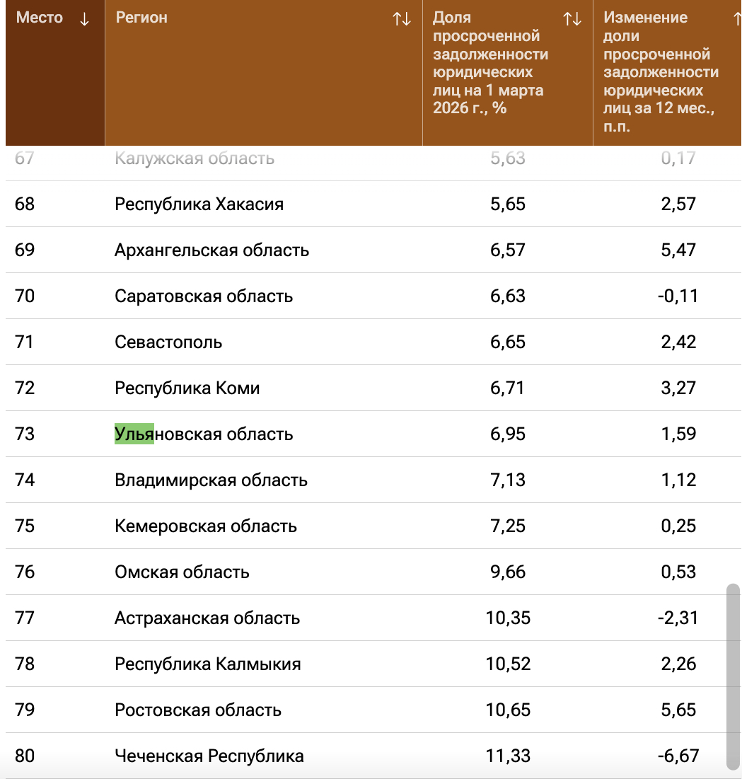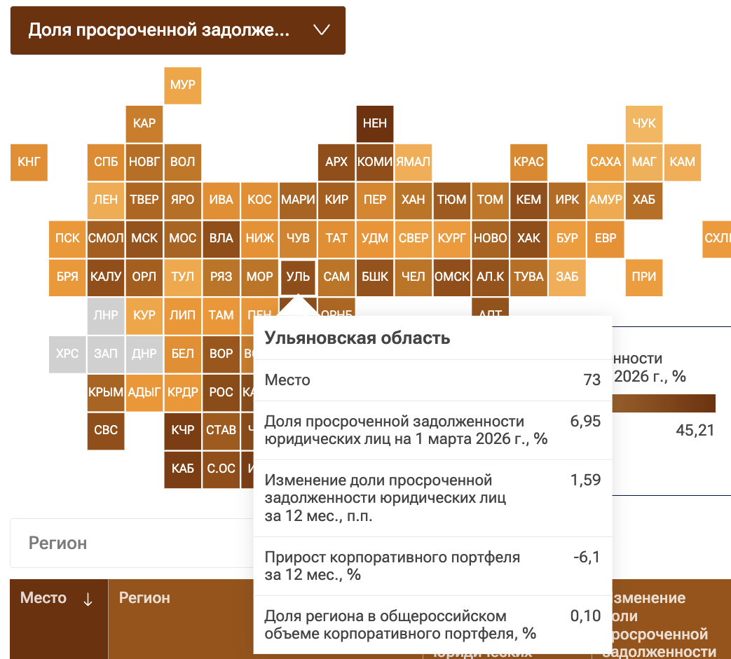 По состоянию на 1 марта 2026 года доля просроченной задолженности по корпоративным кредитам в регионе составила 6,95%. За последние 12 месяцев этот показатель вырос на 1,59 процентных пункта. Параллельно с этим зафиксировано снижение объема корпоративного кредитного портфеля — за год он уменьшился на 6,1%. Доля Ульяновской области в общем объеме корпоративного кредитования по стране составляет 0,10%.