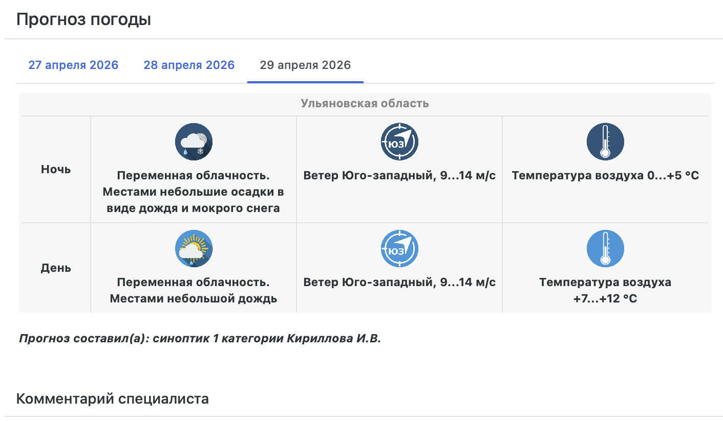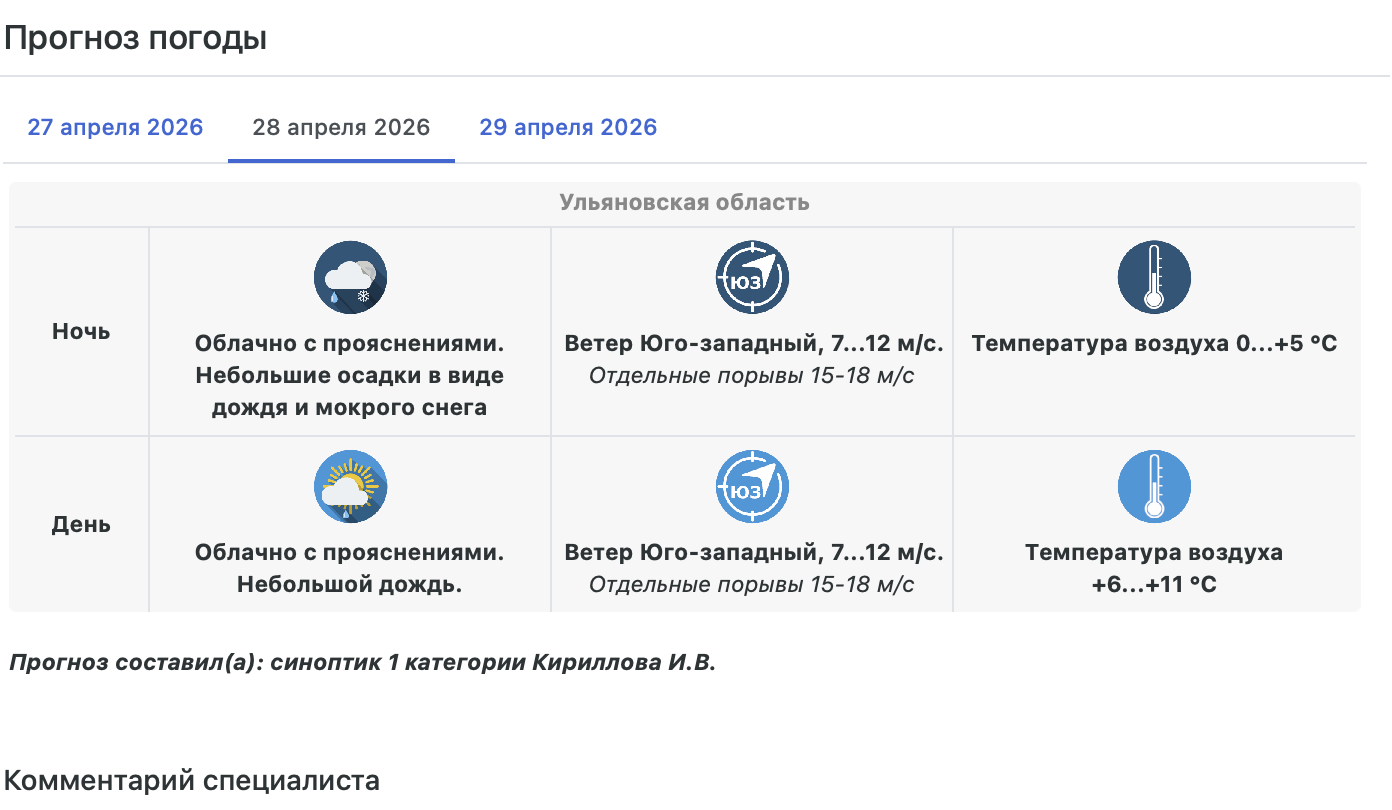 В понедельник, 27 апреля, при прохождении атмосферных фронтов очередного западного циклона на территории области ожидается дождливая ветренная погода.